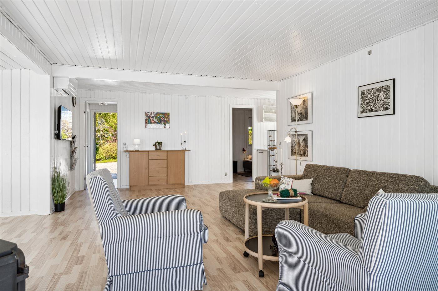 Huset er løbende blevet moderniseret med nye gulve og isolering, så det nu også kan bruges til ferie i vintermånederne. Huset har en dejlig stor stue, med kig til vandet, i åben forbindelse til køkken og spisestue. Der er to gode værelser og et komfortabelt badeværelse og generelt god plads til den lille familie.