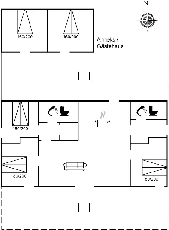 Der er i alt 5 soveværelser. Sovepladserne fordeler sig på: 10 sovepladser i dobbeltsenge. 4 af disse sovepladser befinder sig i anneks.