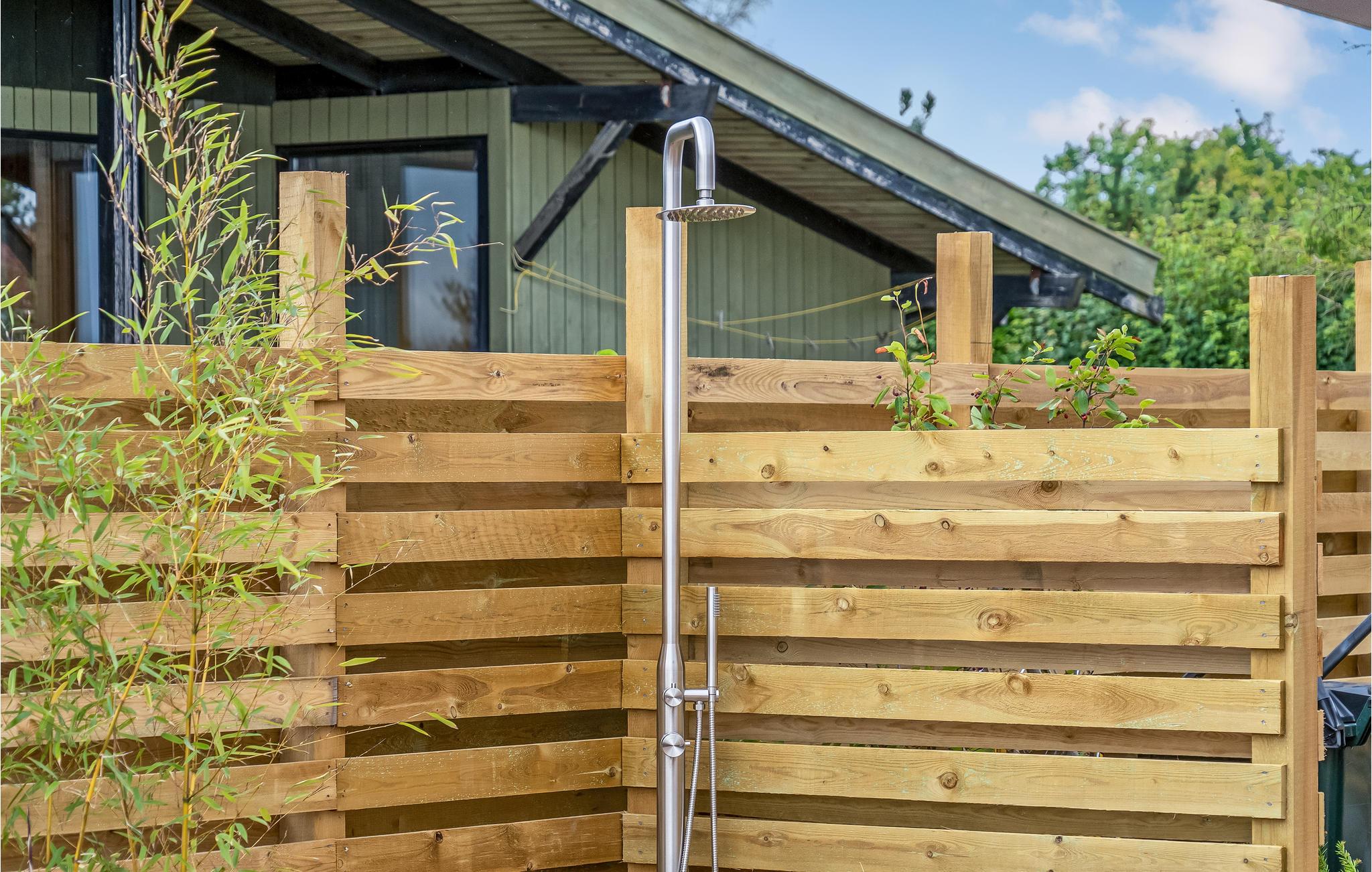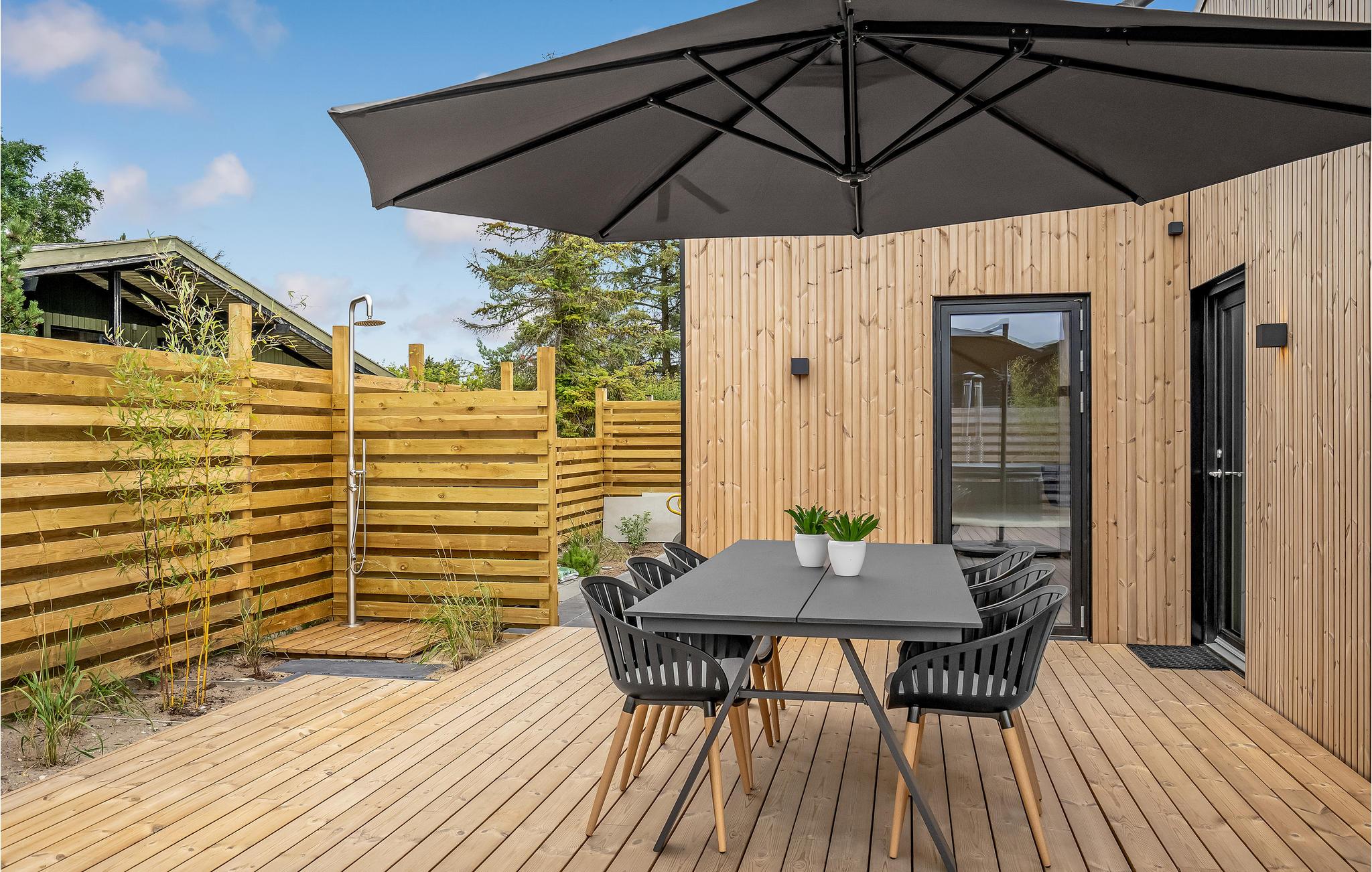Moderne feriehus med panoramaudsigt og vildmarksbad ved Følle Strand, perfekt til afslapning og naturoplevelser.