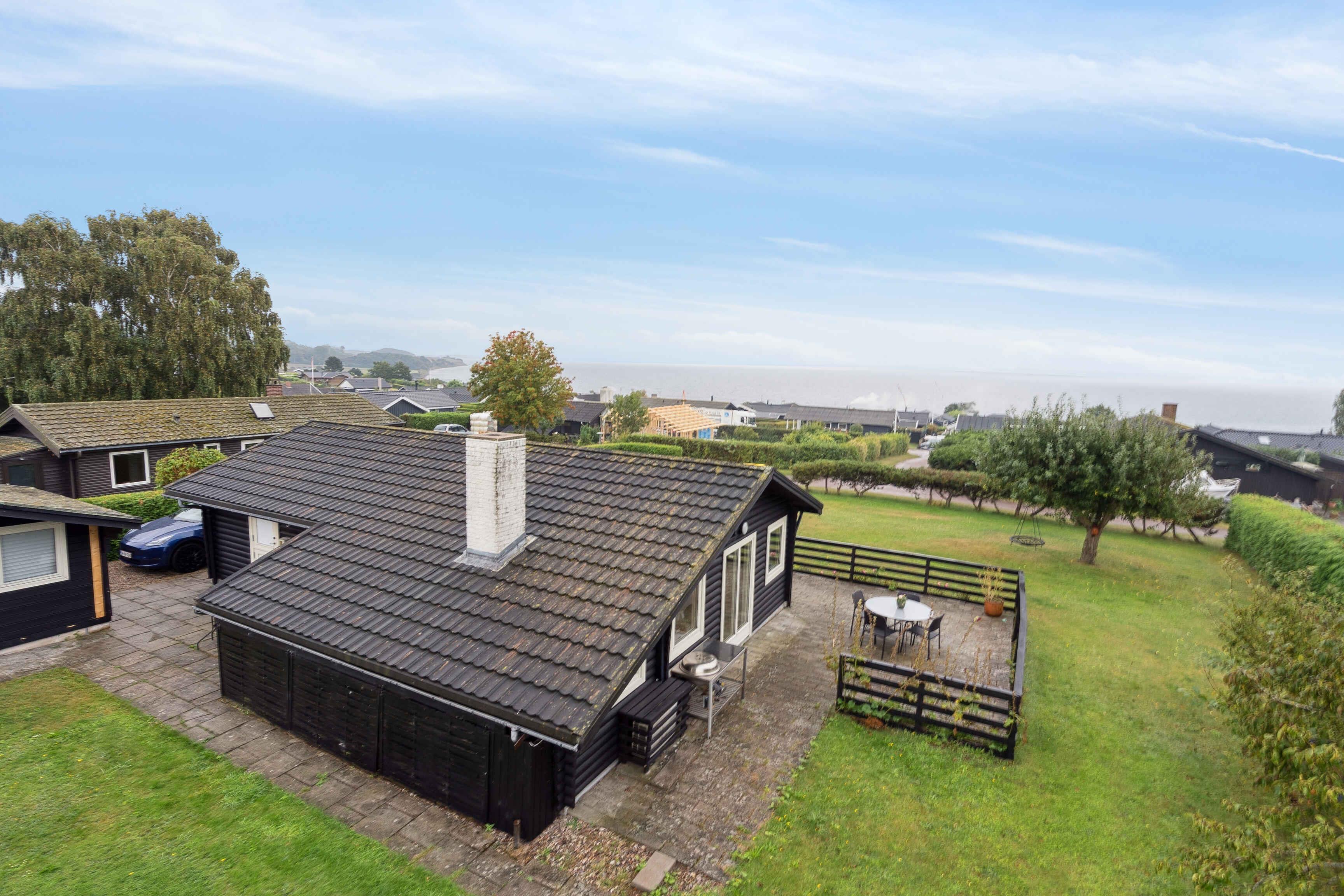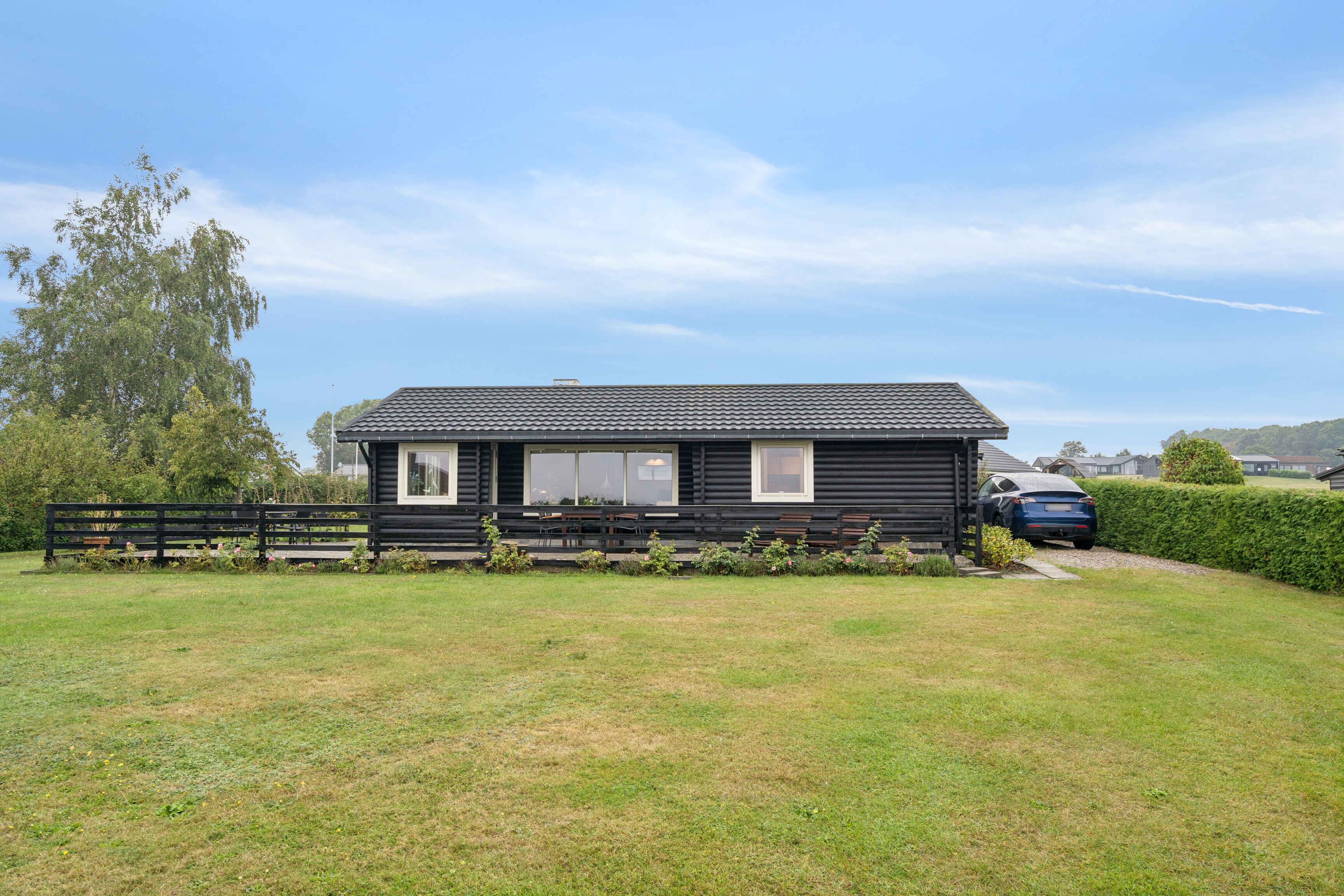 Hyggeligt sort bjælkehus i Horne med panorama havudsigt og stor sydvendt terrasse.