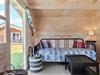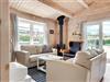 Køkken og stue i åben forbindelse. I den pænt møblerede stue, er der et stor spisebord og hyggeligt sofahjørne. Brændeovn. TV med danske, tyske, svenske og norske kanaler. Fra stuen udgang til dejlig delvis overdækket terrasse med varmelampe, så man også kan sidde ude om aftenen og hygge sig. Internet i huset. Varmepumpe i spiseafdelingen.