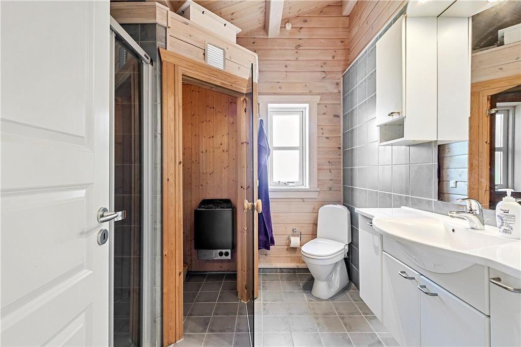 Stort badeværelse med toilet, håndvask, bruser & sauna. Gulvvarme på badeværelset.