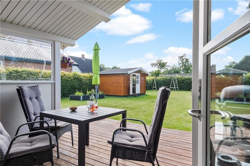Indgang til huset via lille, dejlig terrasse med havemøbler og skøn morgensol – her kan man sidde og nyde morgenkaffen i fred og ro, imens man planlægger dagens spændende aktiviteter.