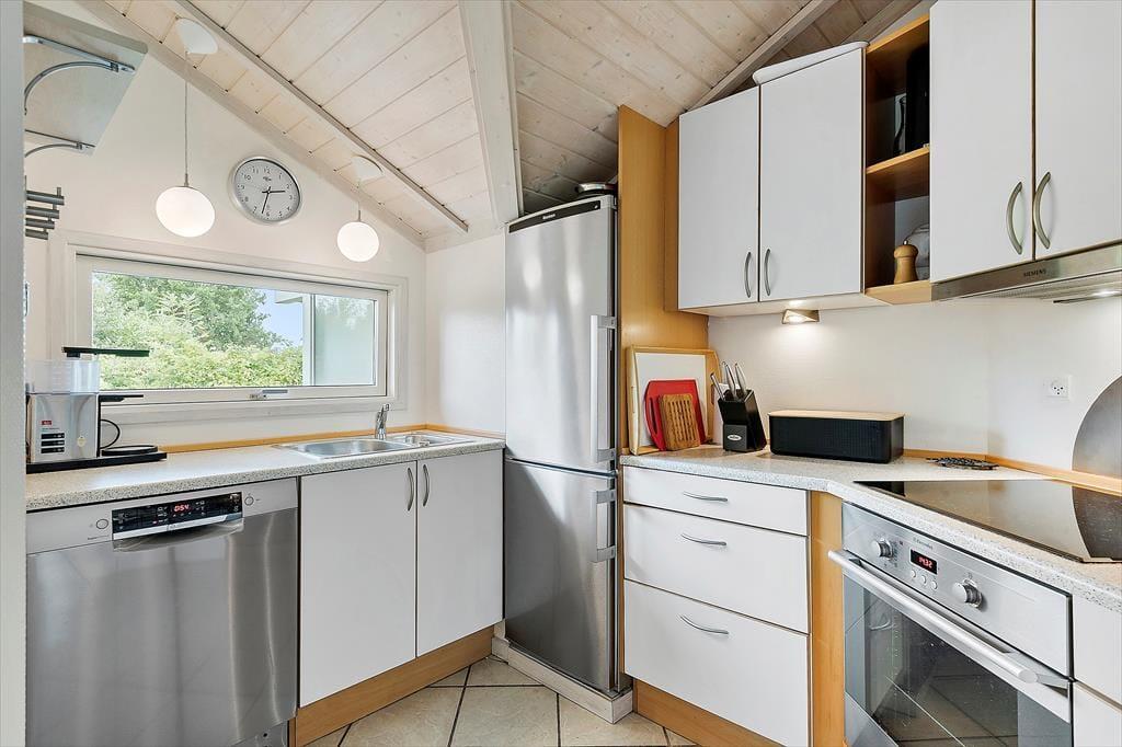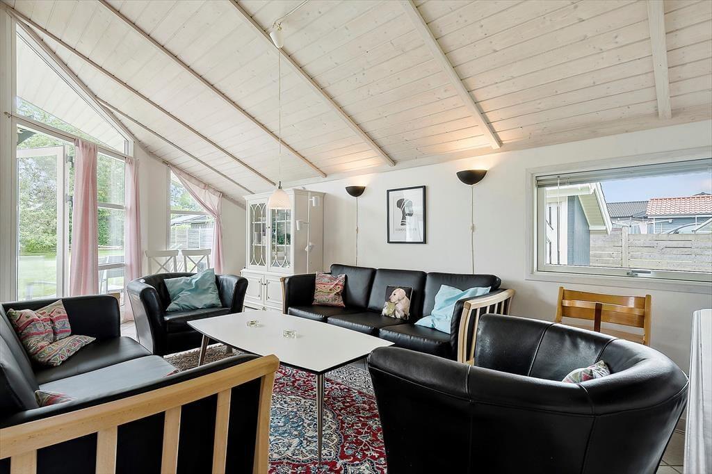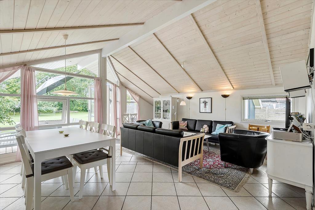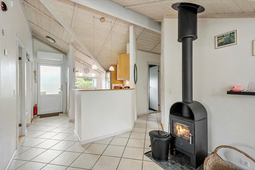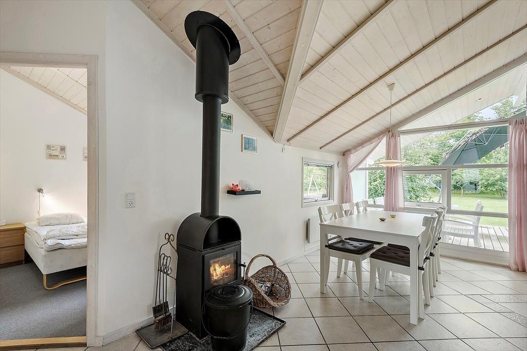 Indenfor finder du en hyggelig og funktionel indretning og 3 soveværelser og her er plads til at I kan nyde ferien og slappe af. I stuen kan du læse en bog eller se tv eller blot lytte til brændeovnens knitren, imens du nyder en kop kaffe og har udsigt til haven. Sommerhusets åbne køkken har direkte forbindelse til stuen, så I kan være sammen, imens I tilbereder dagens måltider. Fra stuen er der udgang til en dejlig træterrasse og have. Her er et stort badeværelse med spa og en sauna, vaskemaskine og tørretumbler.