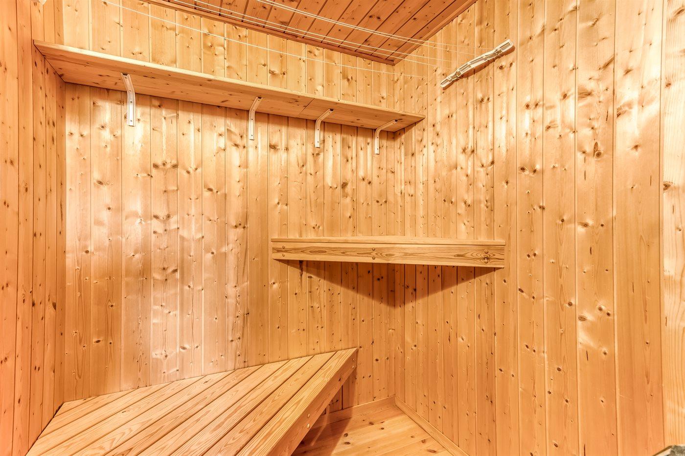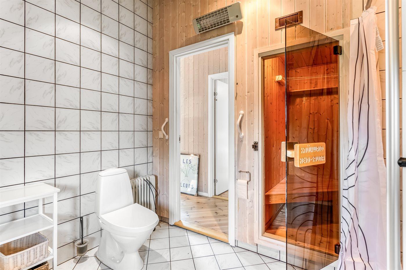 Der er 1 badeværelse med bruseniche og 1 toilet.. Der er gulvvarme på 1 badeværelse. I saunaen er der mulighed for afslapning.