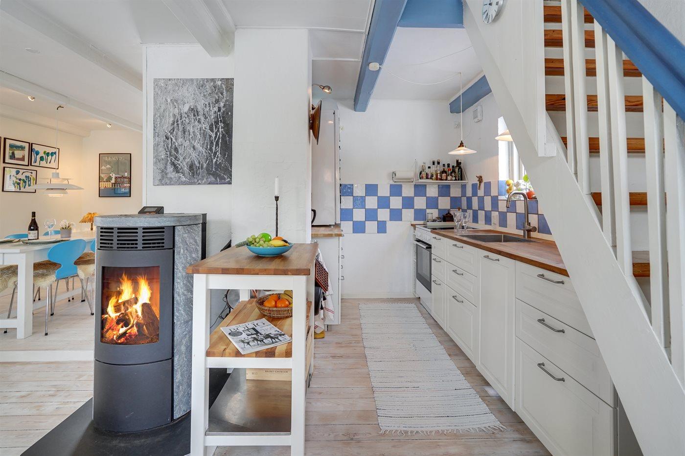 Køkkenet er udstyret med 1 køleskab. Der er 4 keramiske kogeplader, varmluftovn samt opvaskemaskine.