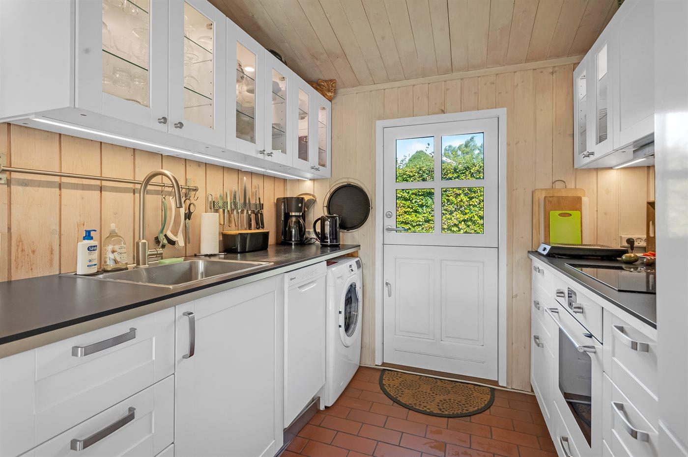 Køkkenet er udstyret med 1 køleskab. Der er 4 keramiske kogeplader, varmluftovn samt opvaskemaskine.