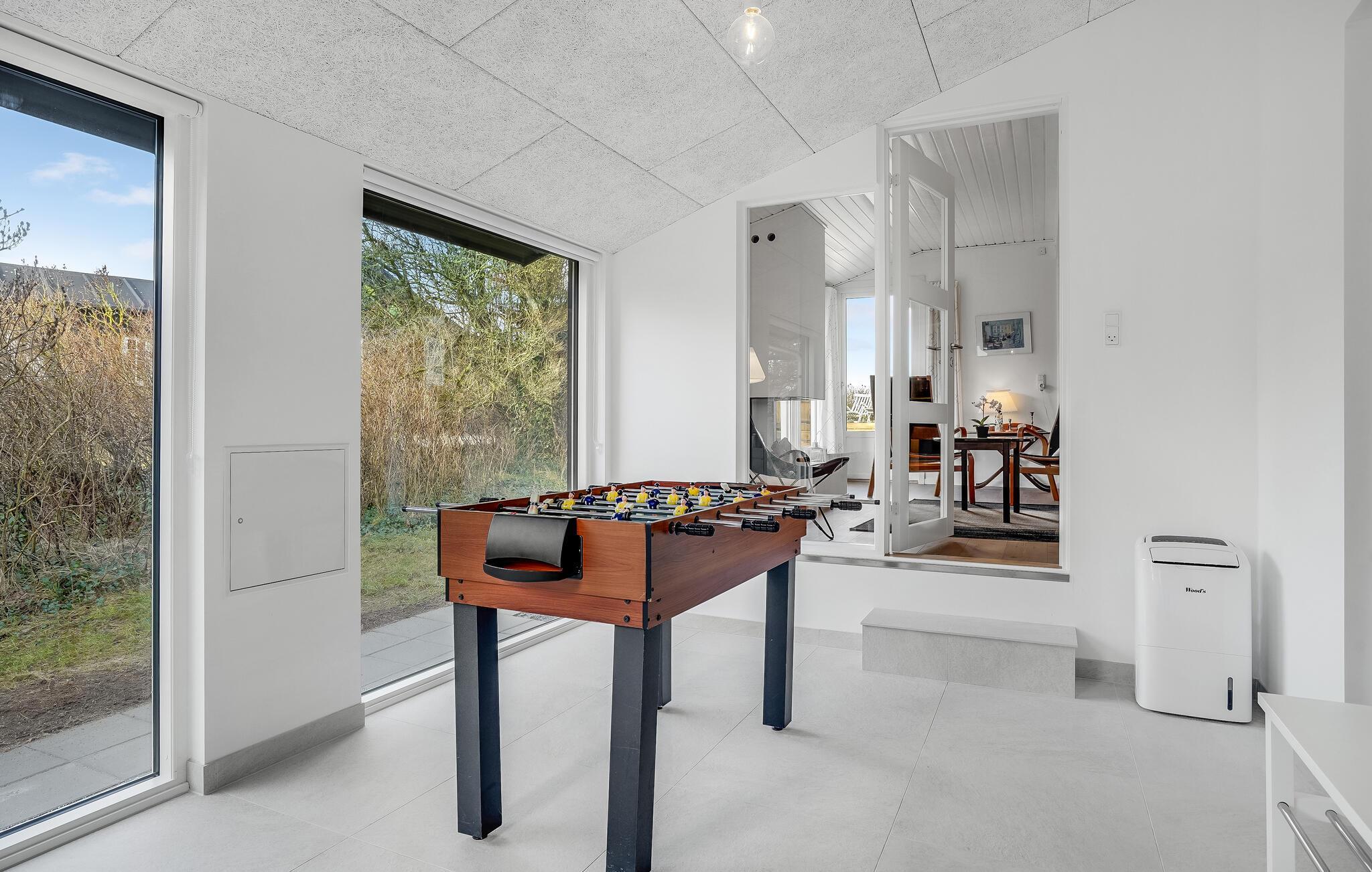 Husets indretning er noget særligt med moderne indretning og en åben grundplan. Find jer godt til rette i den store sofa eller samles med familien ved spisebordet. Det lyse køkken byder på god plads til at lave mad sammen med udsigt over landskabet. Brug aktivitetsrummet med bordfodbold, tag en dukkert i den private indendørs pool, eller slap af i saunaen.