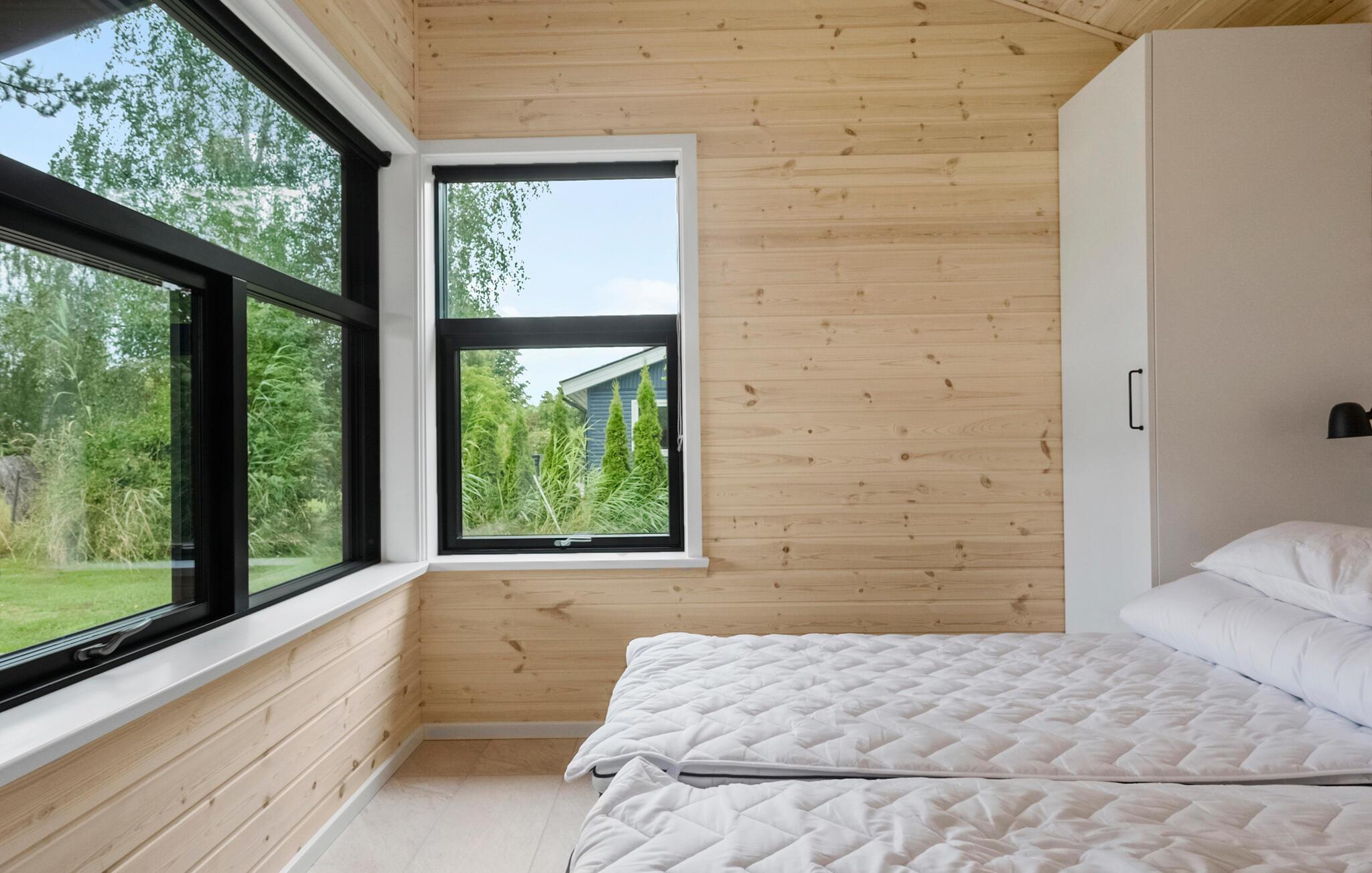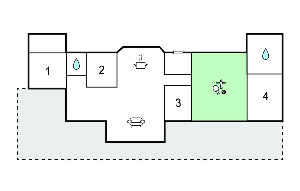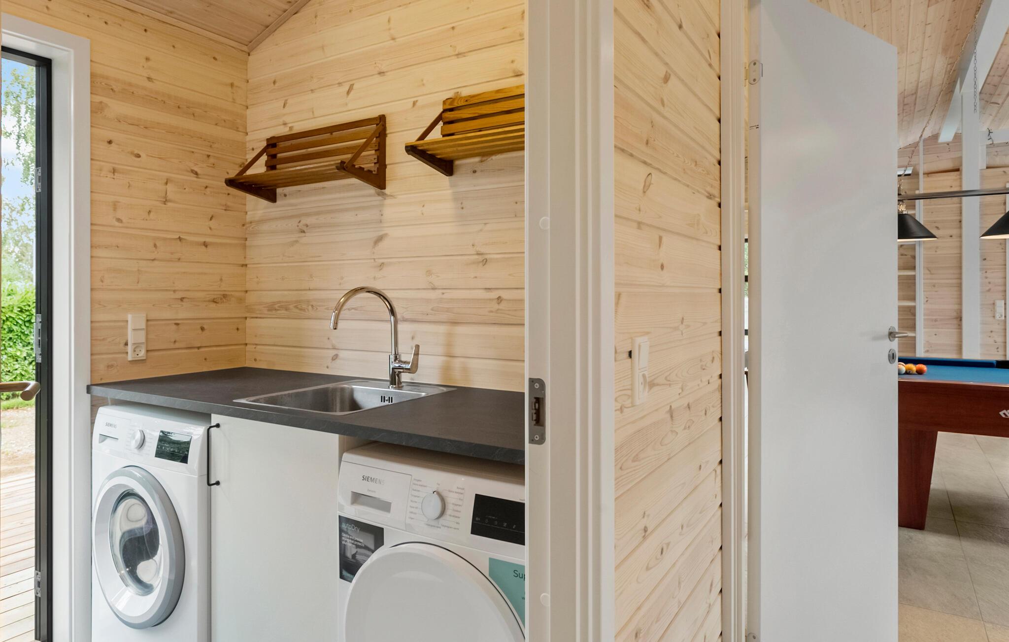 Dette etplans feriehus har et lyst og stilfuldt interiør. Masser af træ, store vinduer med smuk udsigt over de grønne omgivelser og hyggelig belysning skaber en virkelig behagelig atmosfære. Snak ved det lange spisebord, spil billard eller bordtennis eller lad børnene vælge et brætspil. Lyt til den knitrende brændeovn, mens I slapper af i lænestolen eller tryll en lækker middag frem i det indbydende køkken.