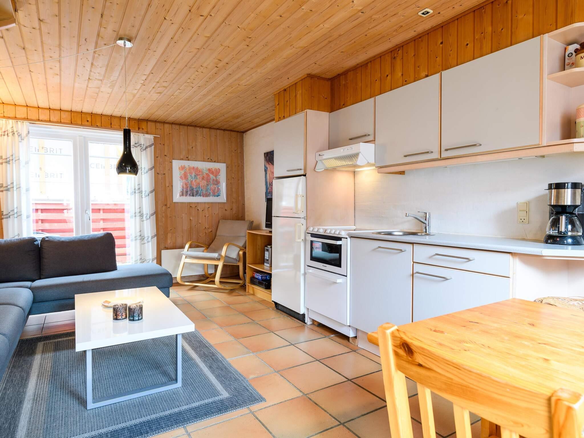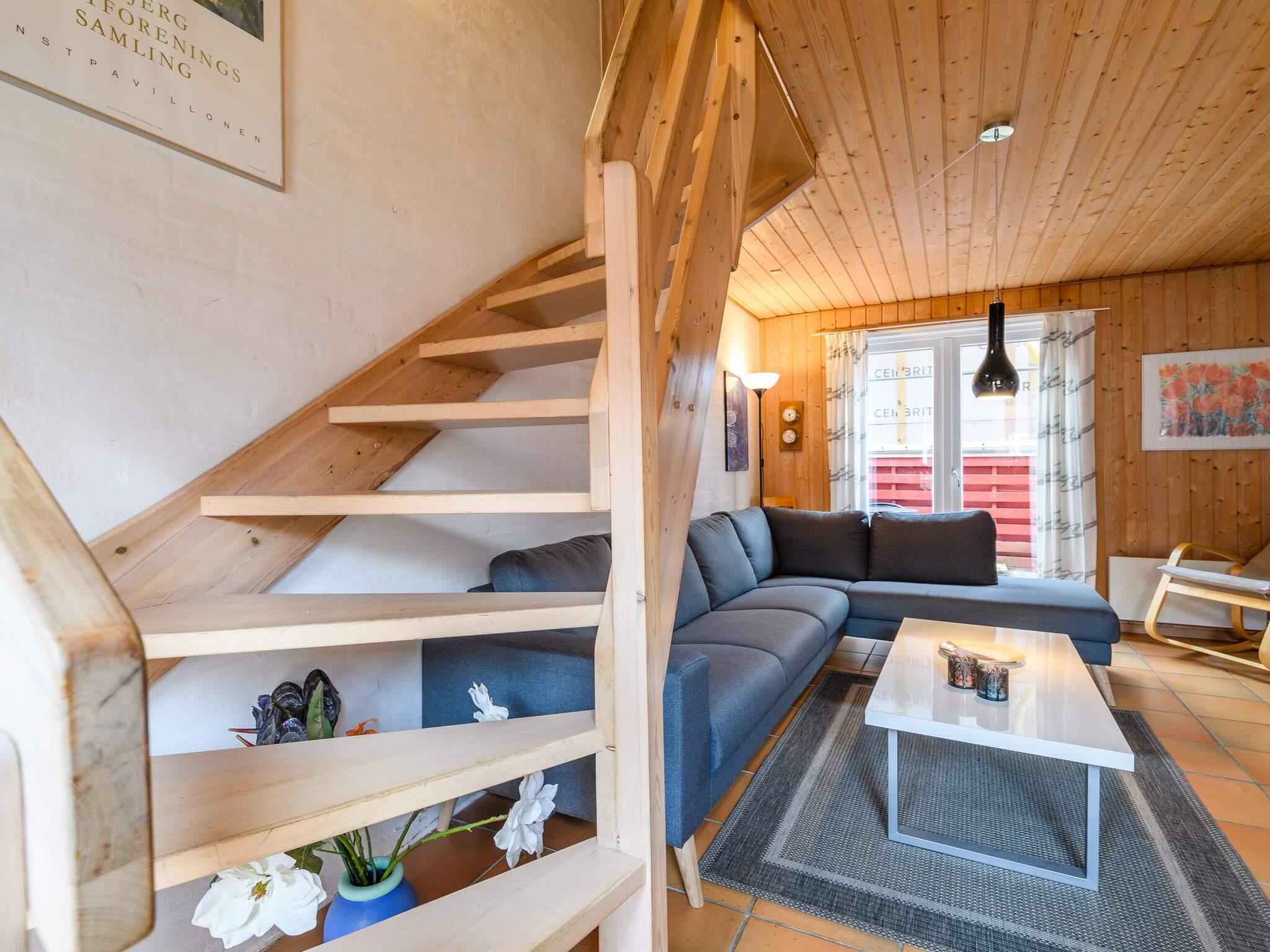 Indvendigt byder stueetagen på et lyst køkken og spiseplads i åbent plan, en komfortabel stue og direkte adgang til en privat terrasse, hvor du kan nyde frisk havluft på ethvert tidspunkt af dagen. Køkkenet er veludstyret med komfur, mikroovn, opvaskemaskine, kaffemaskine og køle-fryseskab, mens opholdsstuen indbyder til at sætte farten ned og slappe af efter lange strandture. Ovenpå finder du et soveværelse med dobbeltseng med en 140 cm seng, et andet soveværelse med en køjeseng egnet til børn og et badeværelse. En stigetrappe fører også til en lille hems, der giver ekstra plads, der tilføjer boligens hyggelige karakter.