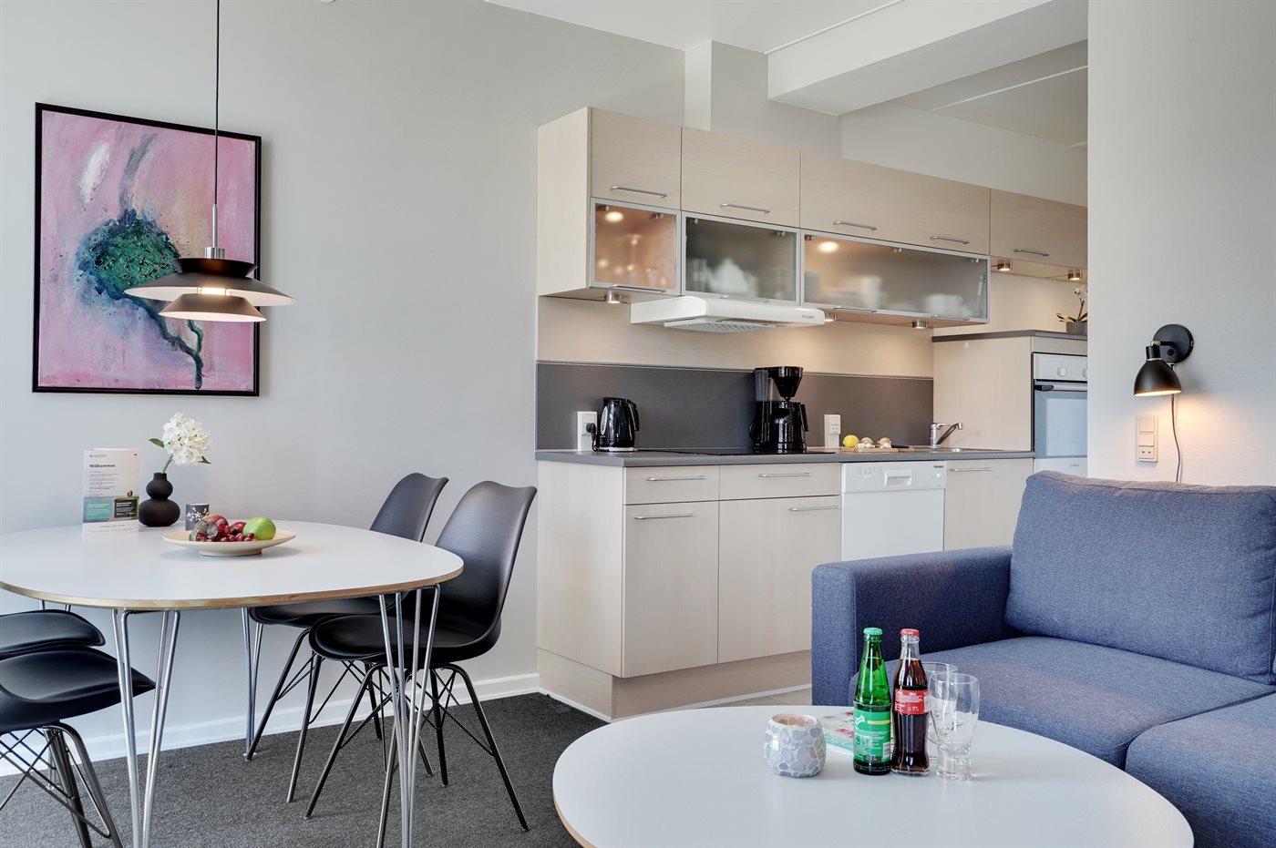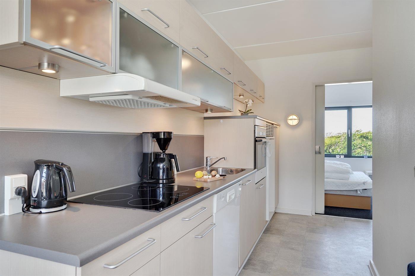 Køkkenet er udstyret med 1 køleskab. Der er 4 keramiske kogeplader, varmluftovn, mikrobølgeovn samt opvaskemaskine.