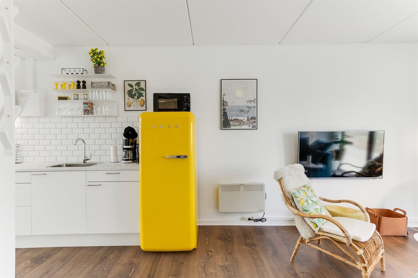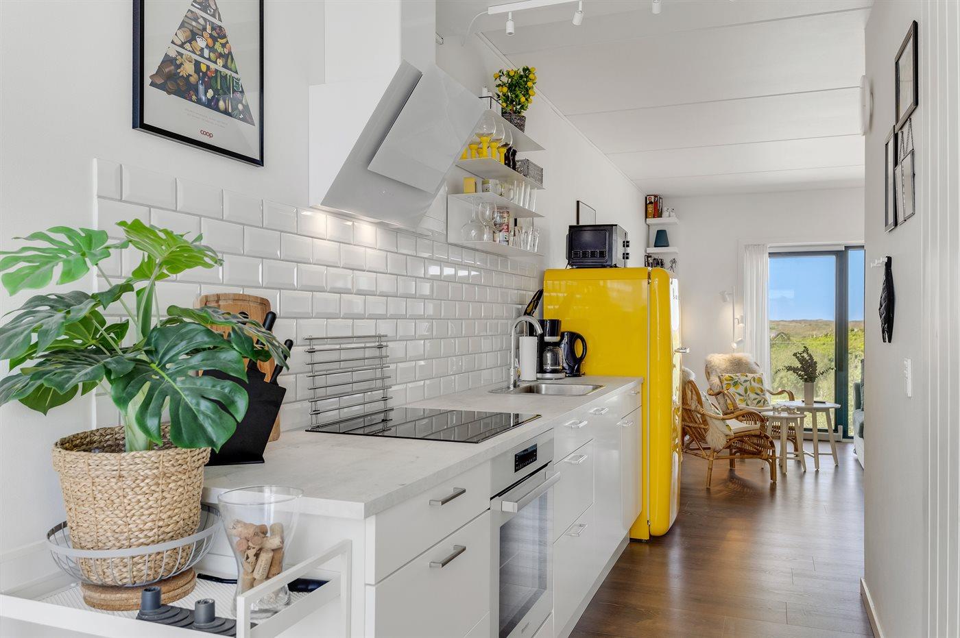 Køkkenet er udstyret med 1 køleskab. Der er 4 keramiske kogeplader, varmluftovn, mikrobølgeovn.