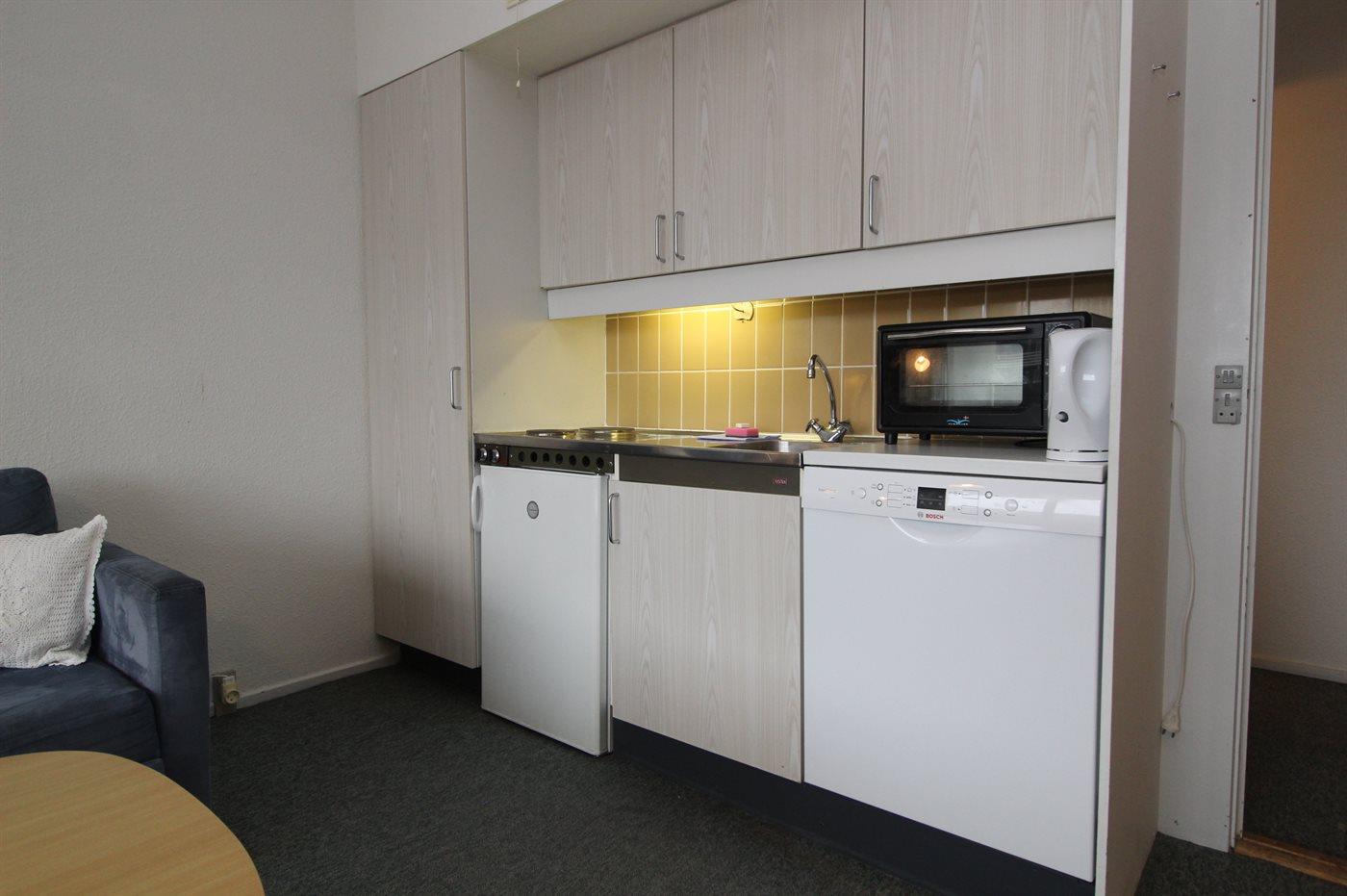Køkkenet er udstyret med 1 køleskab. Der er 2 elkogeplader, miniovn, varmluftovn, mikrobølgeovn samt opvaskemaskine.