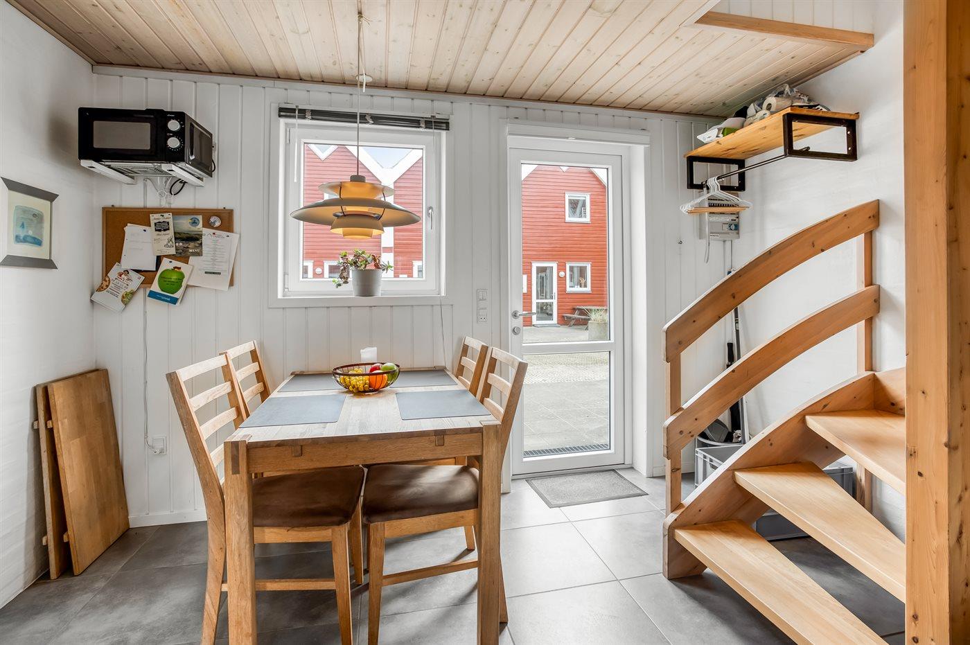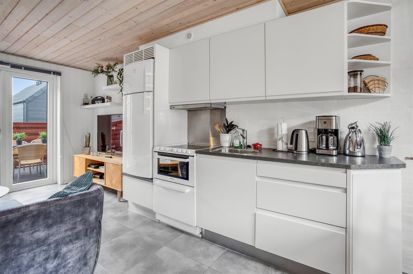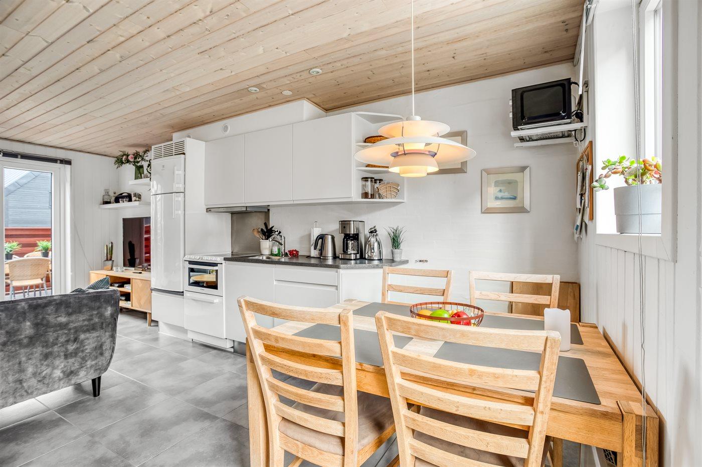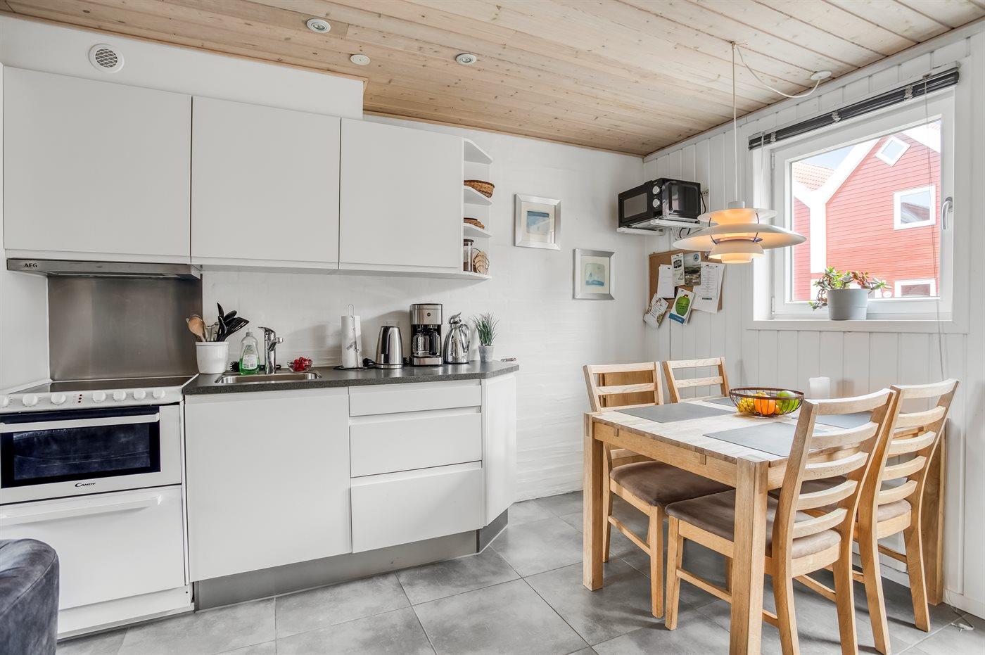 Køkkenet er udstyret med 1 køleskab. Der er 4 keramiske kogeplader, varmluftovn, mikrobølgeovn samt opvaskemaskine.