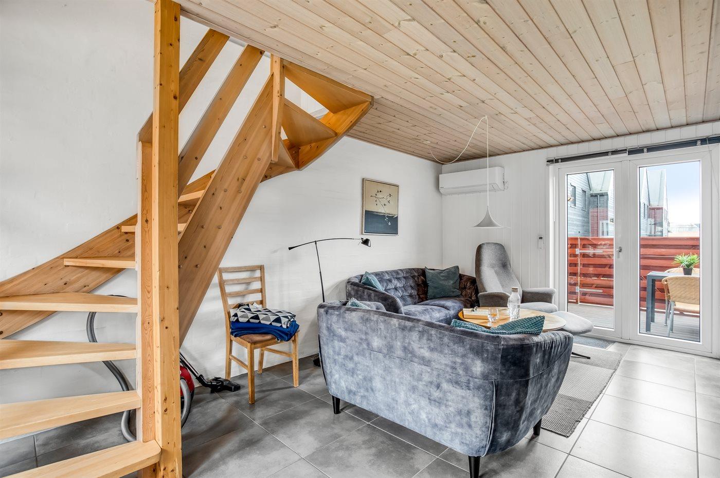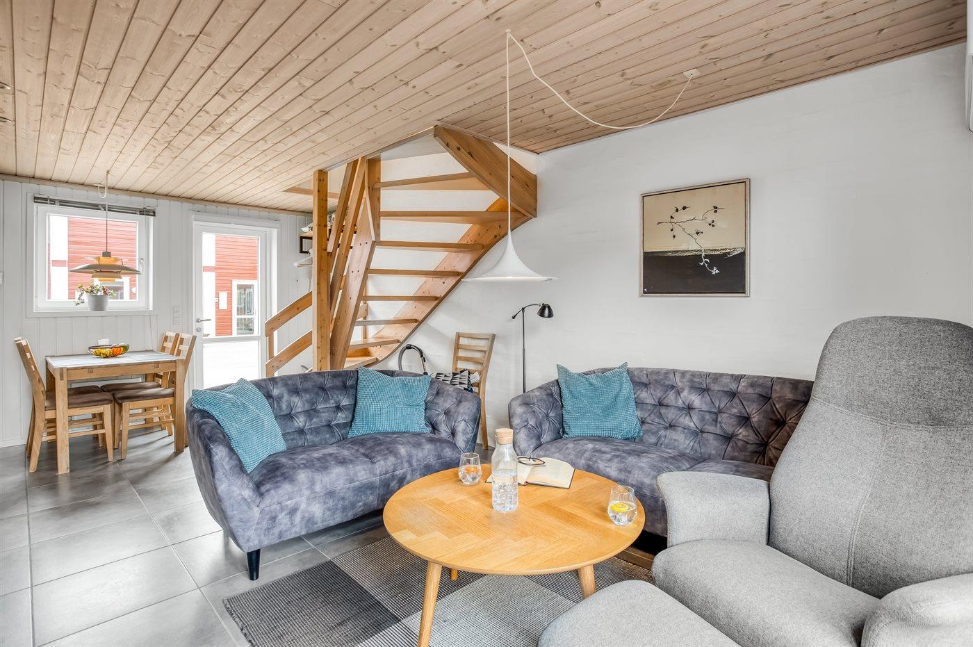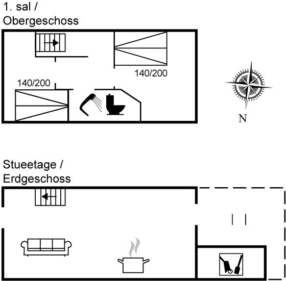 Et pænt og hyggeligt sommerhus, hvor 1. sal er indrettet med to soverum, badeværelse og stige op til sovehems. Terrasse mod vest. Fælles sandkasse og gynge til rådighed.