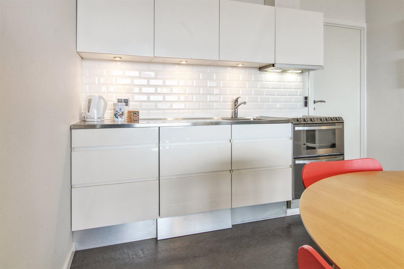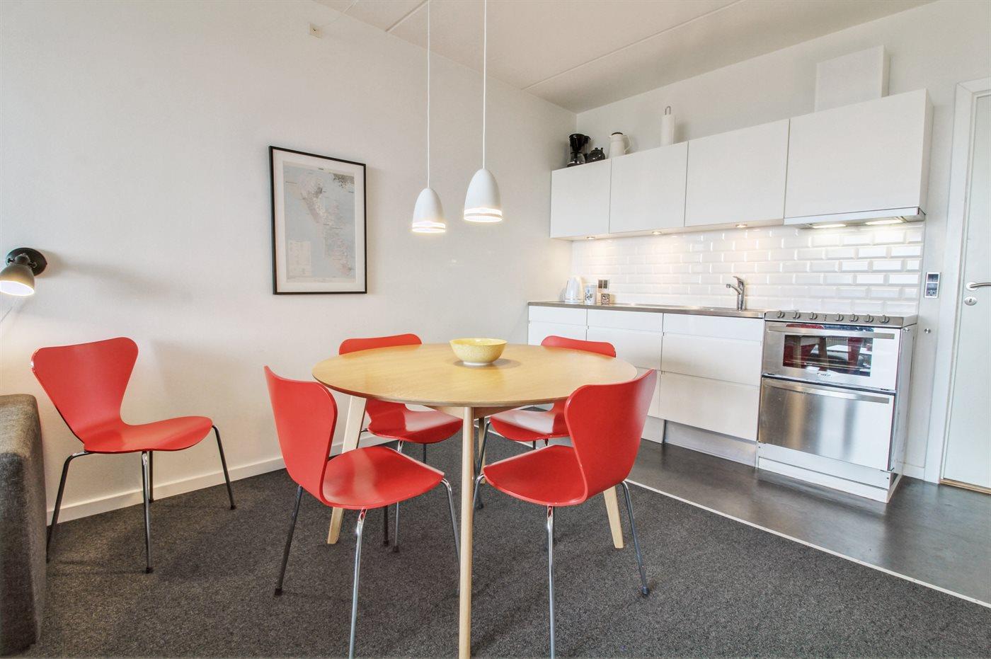 Køkkenet er udstyret med 1 køleskab. Der er 4 elkogeplader. Der findes komfur med opvaskemaskine, varmluftovn.