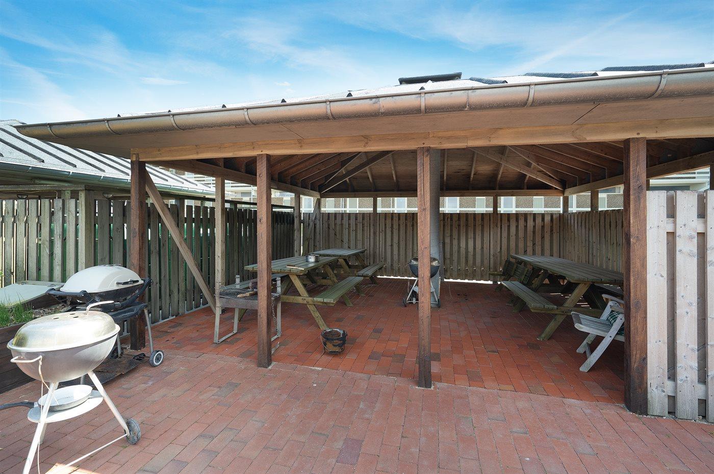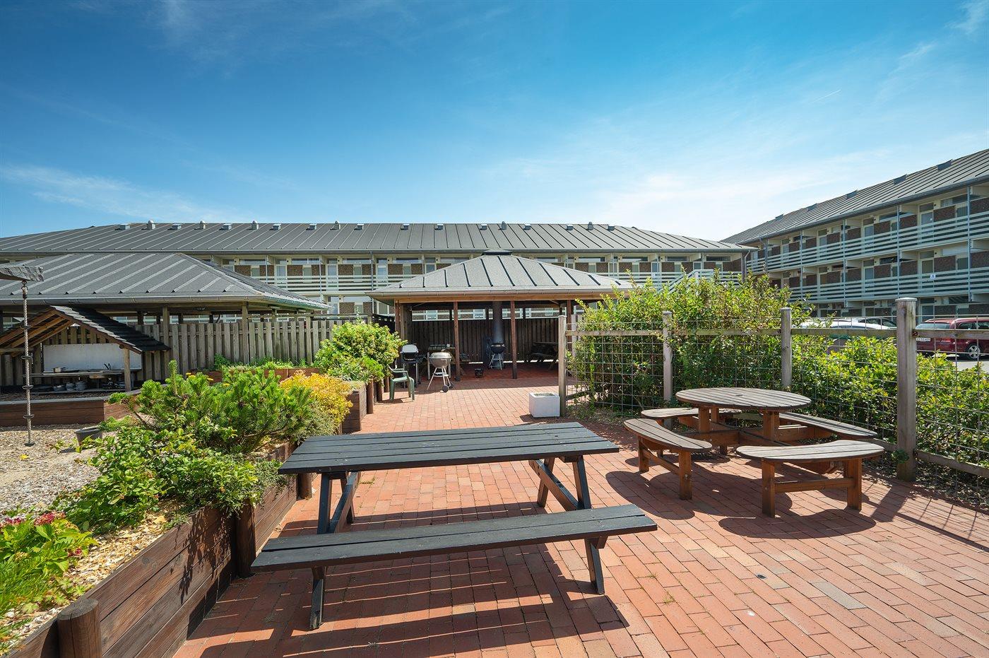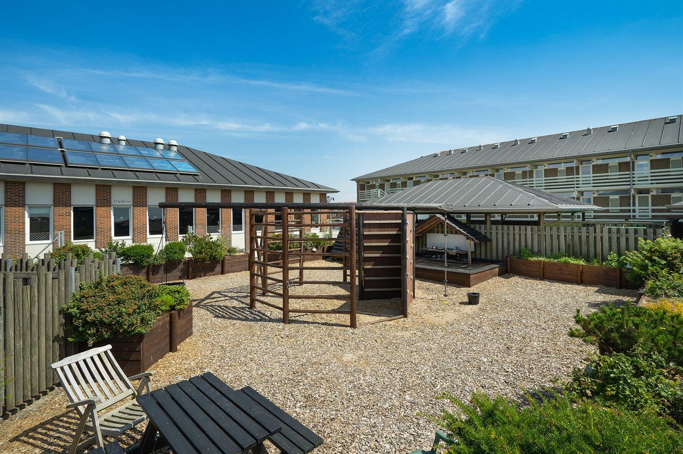Dejlige udendørsarealer med grillområder, borde-bænke og pentanquebane.