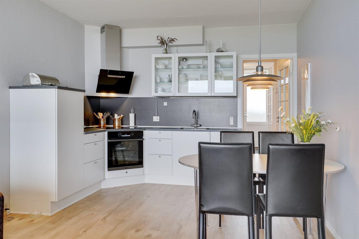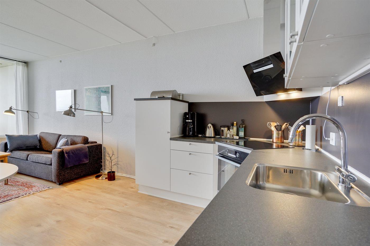 Køkkenet er udstyret med 1 køleskab. Der er 2 elkogeplader. Der findes komfur med opvaskemaskine.