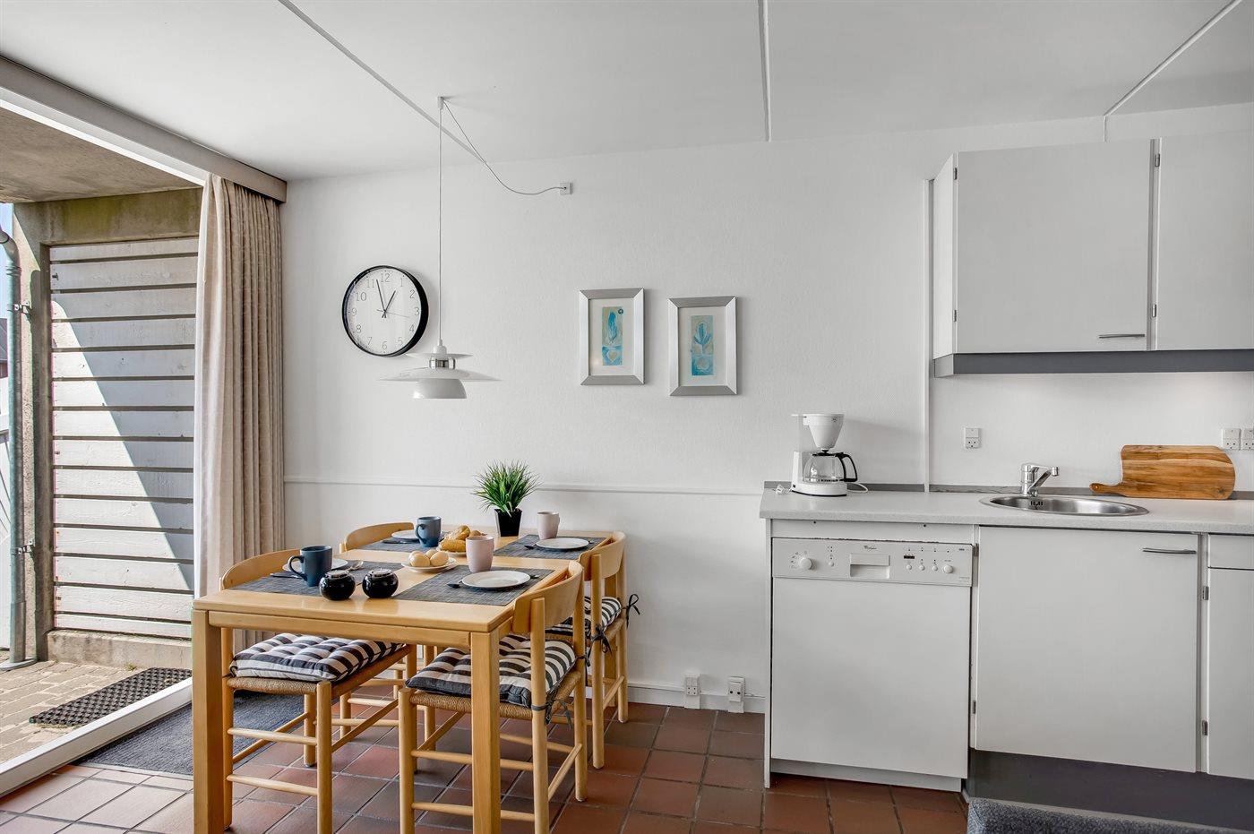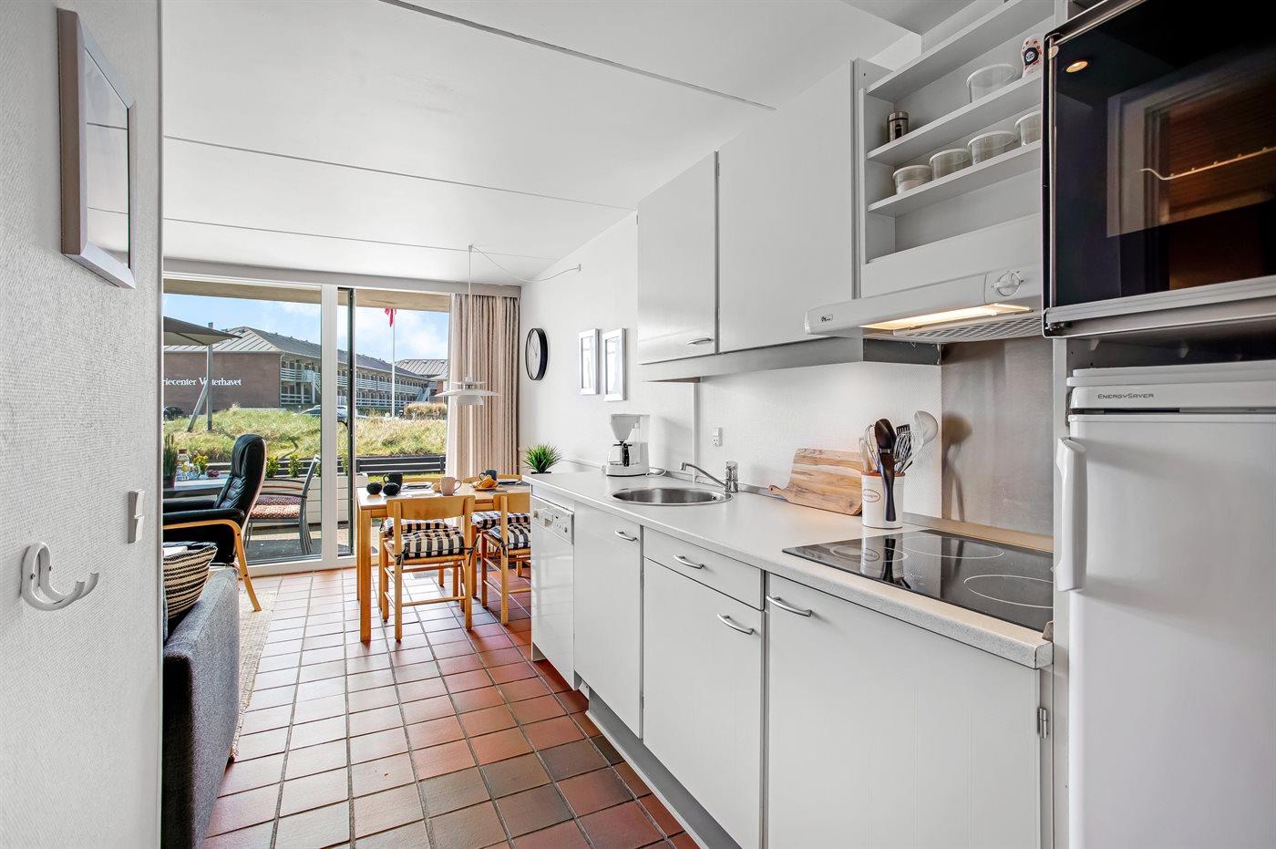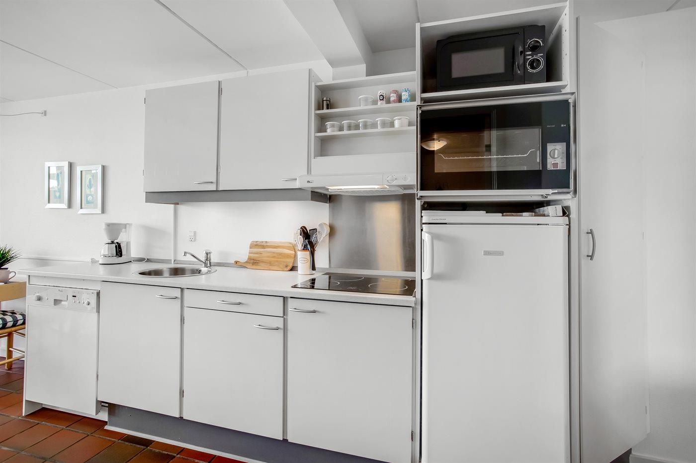 Køkkenet er udstyret med 1 køleskab. Der er 4 keramiske kogeplader, bageovn, mikrobølgeovn samt opvaskemaskine.
