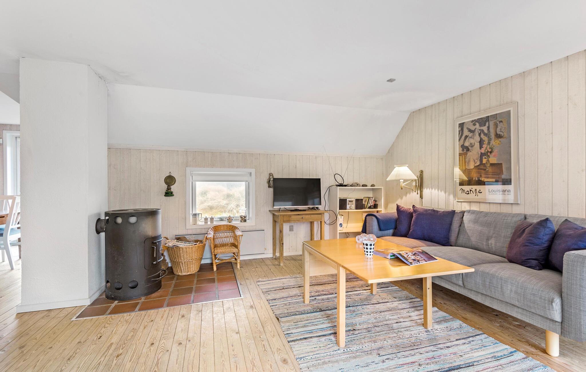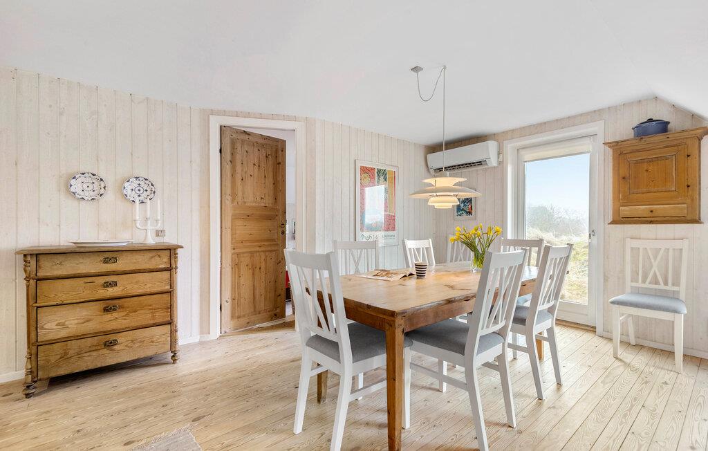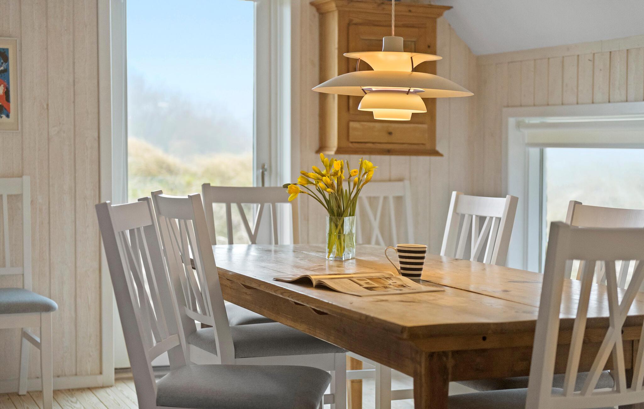 Huset er både charmerende og indbydende, og indretningen emmer simpelthen af hygge med sin åbne planløsning og træelementer i varme farver. Den står på klassisk feriehygge med god tid til madlavningen, hyggelige fælles måltider og ægte afslapning på sofaen. Og alt sammen foregår det med en dejlig udsigt til det åbne klitlandskab.