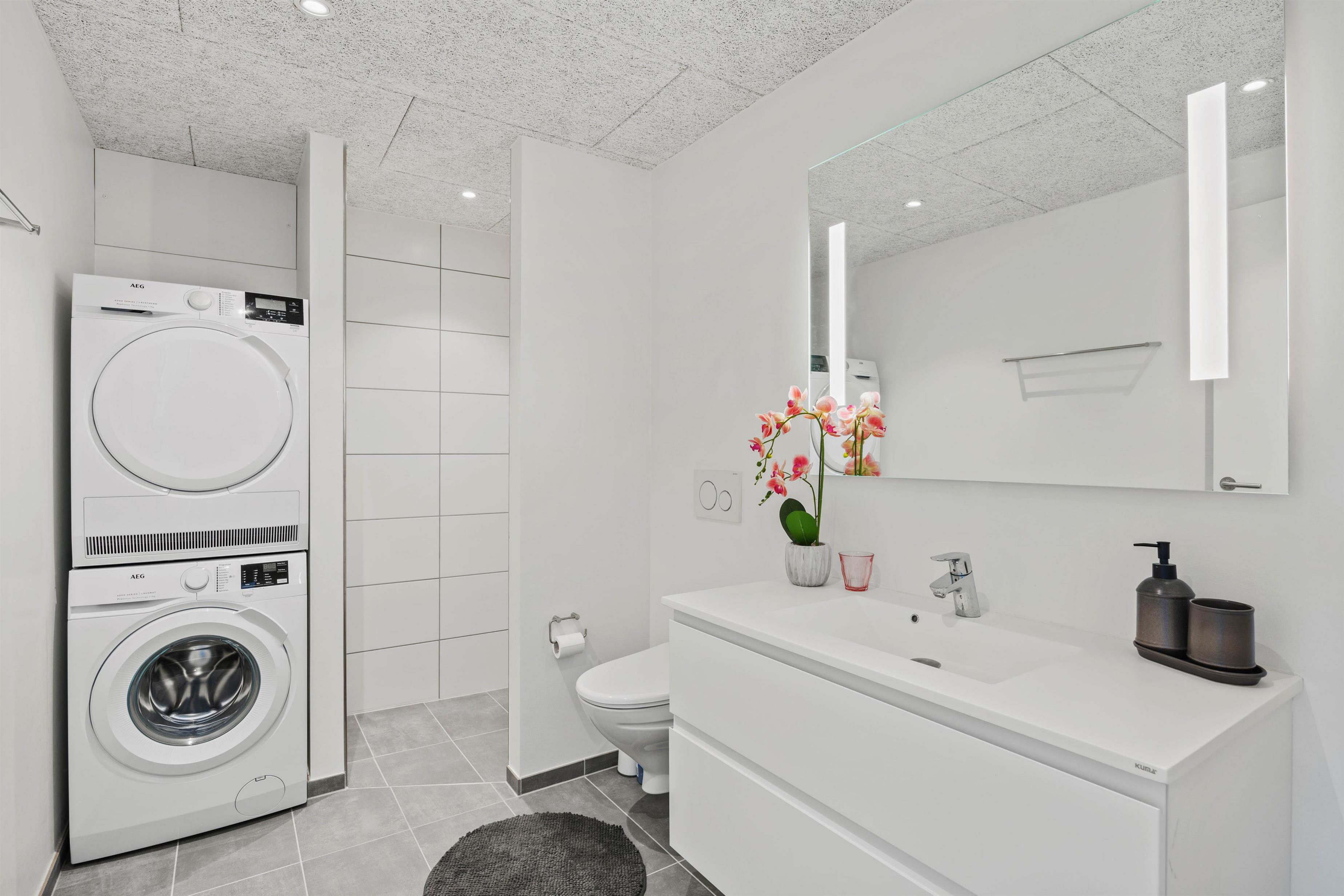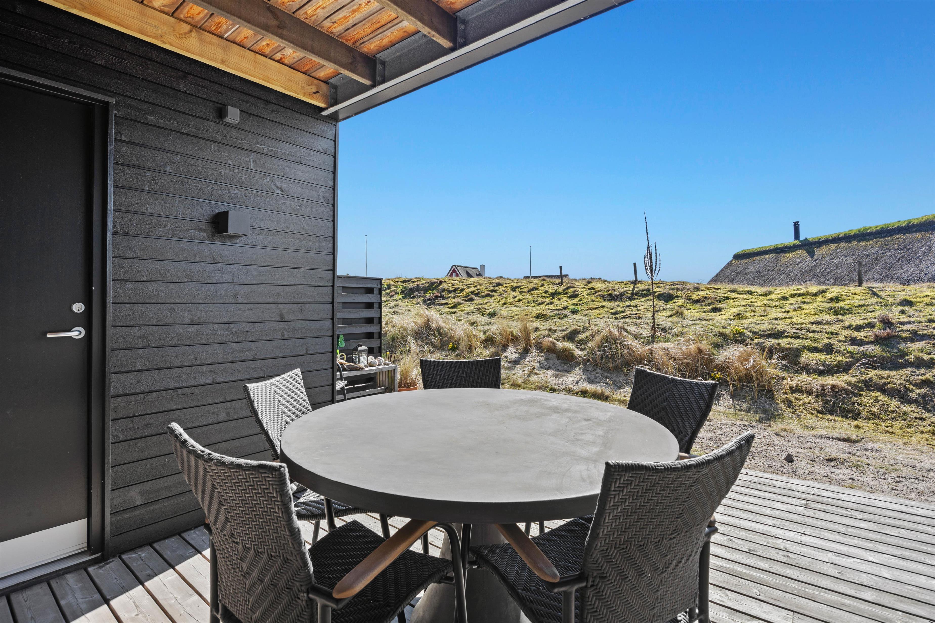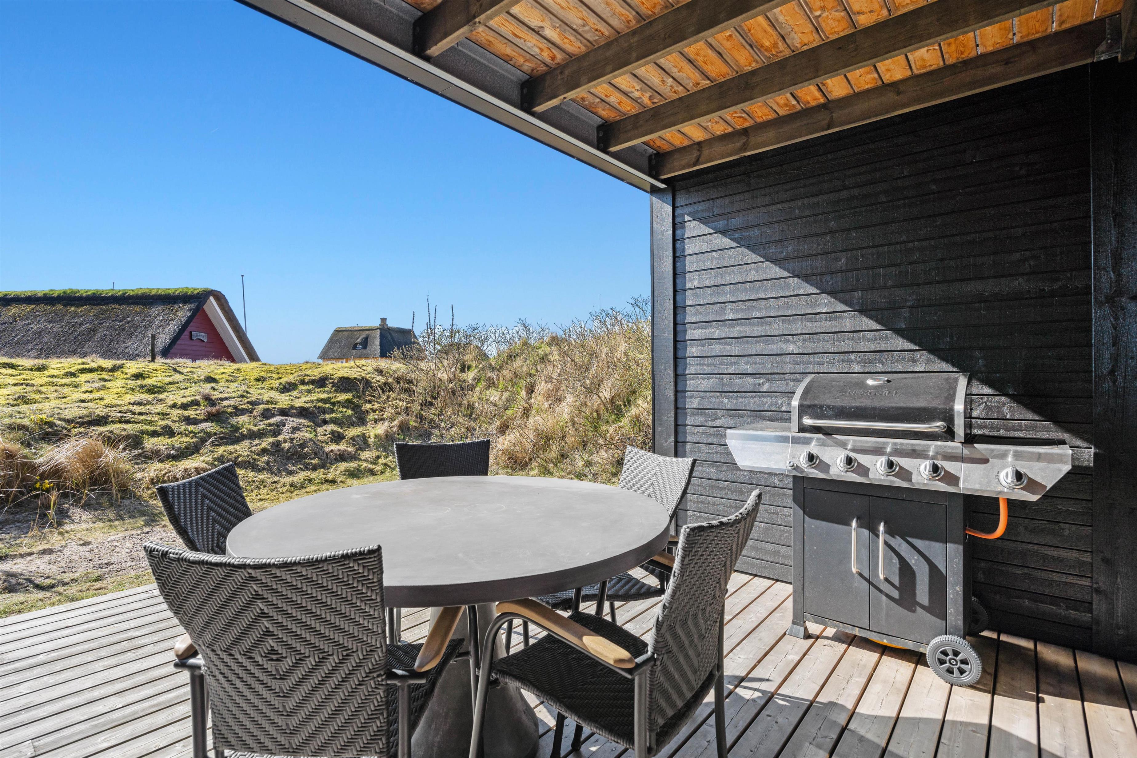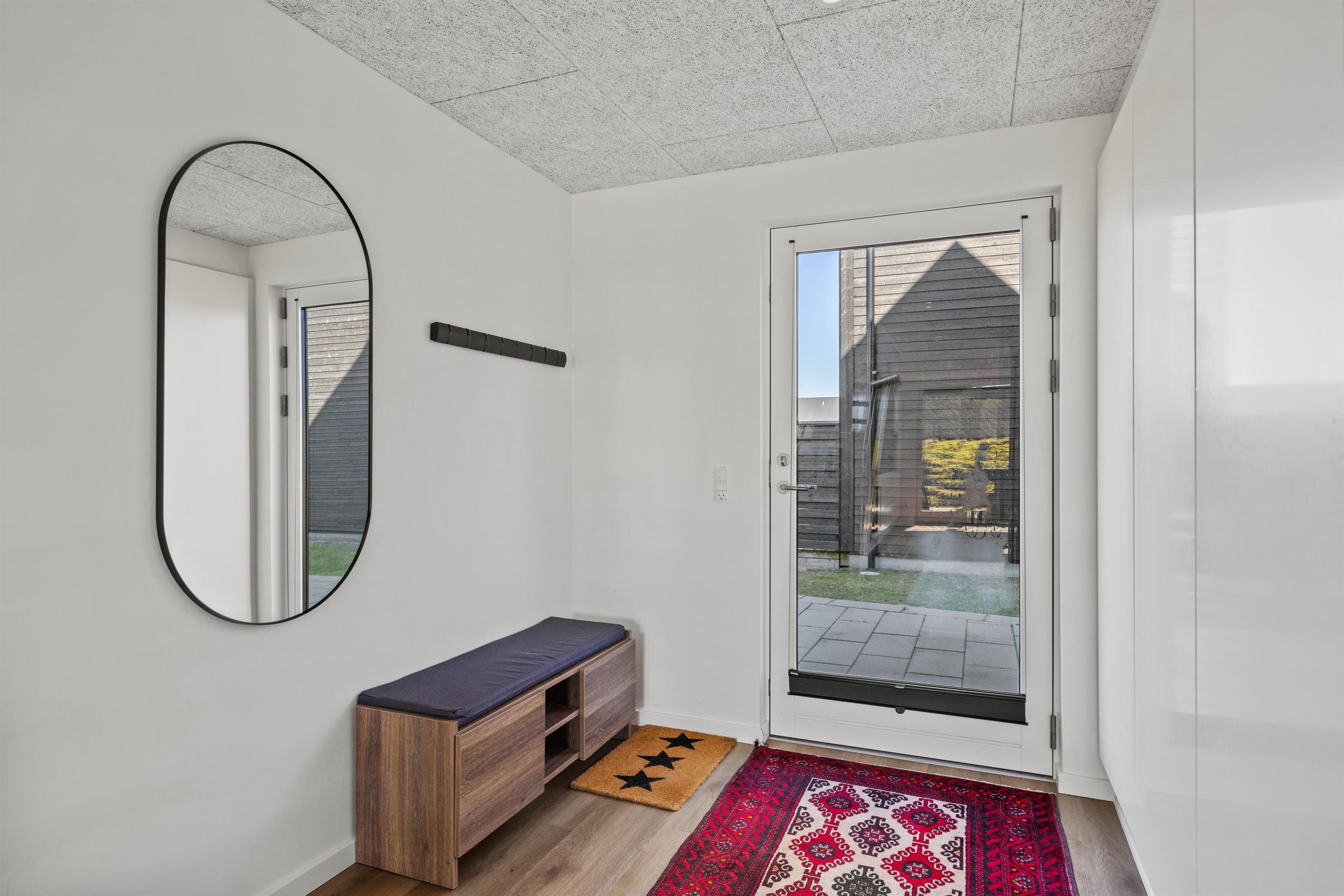 Fra køkkenet har udgang til den delvist overdækkede og afskærmede terrasse. Her kan I nyde den friske luft i læ, hvad enten det er til en afslappende stund i havemøblerne eller en grillaften med mad tilberedt på gasgrillen. Solbadning og hyggelige udendørs måltider er oplagte muligheder her.