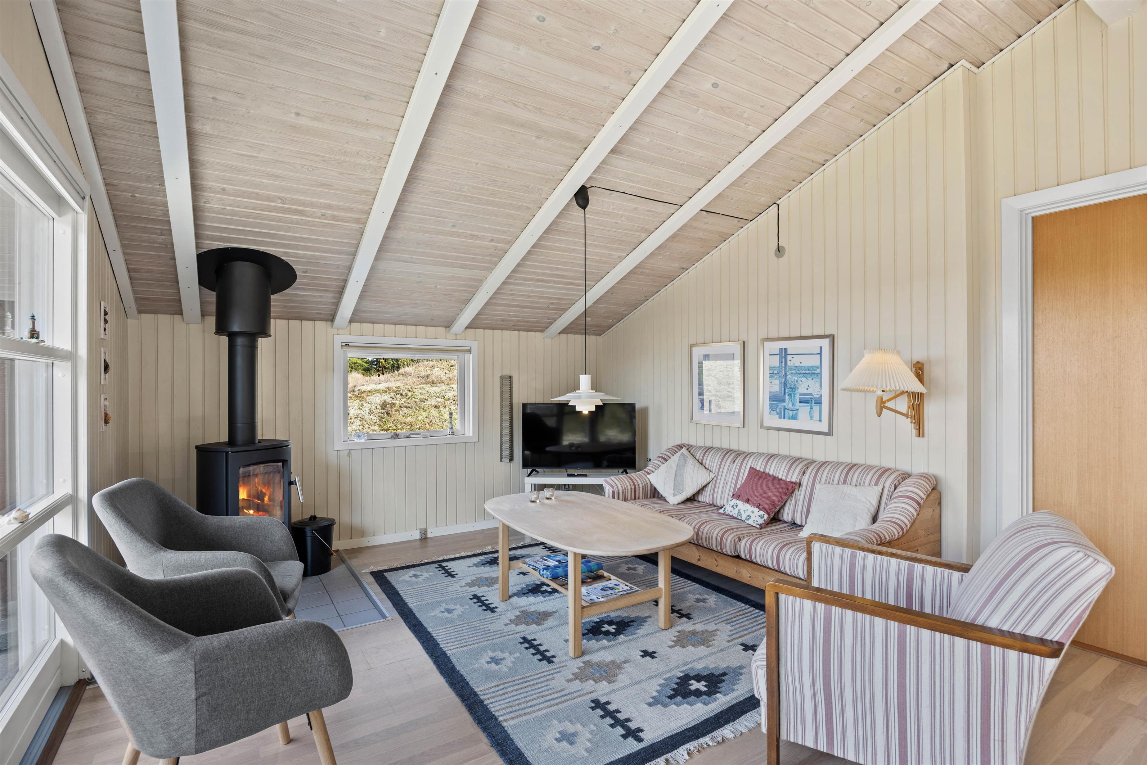 I den hyggelige stue på Norges Fjelde 23 kan I slappe af på sofaen, se fjernsyn eller lytte til den knitrende ild fra brændeovnen og lade roen indfinde sig. Der er en energibesparende luft-til-luft varmepumpe, som hurtigt og effektivt sørger for et behageligt indeklima og en god temperatur året rundt.