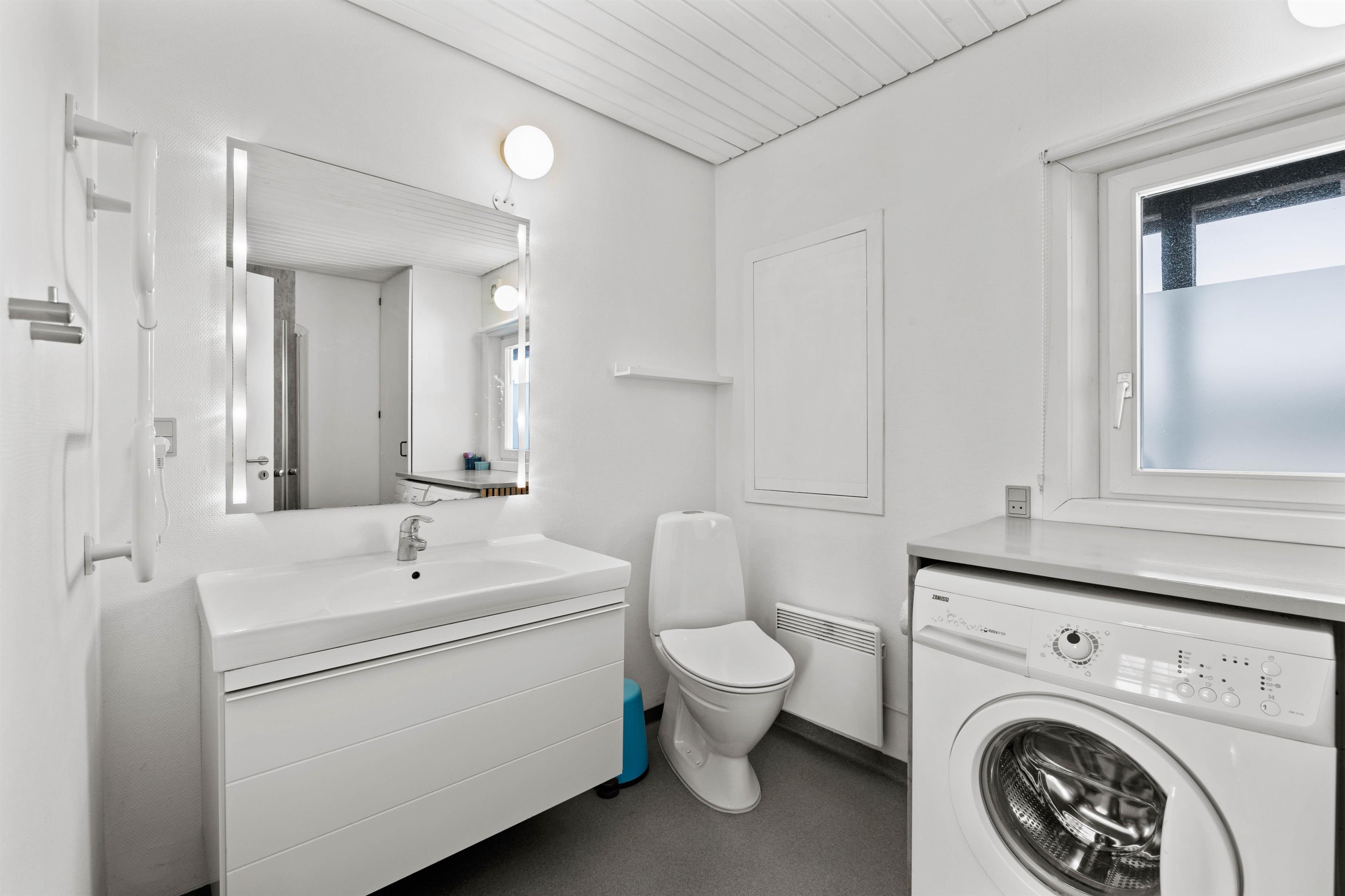 På sommerhusets badeværelse er der en vaskemaskine, så I har mulighed for at vaske lidt tøj eller håndklæder i løbet af jeres ferie.