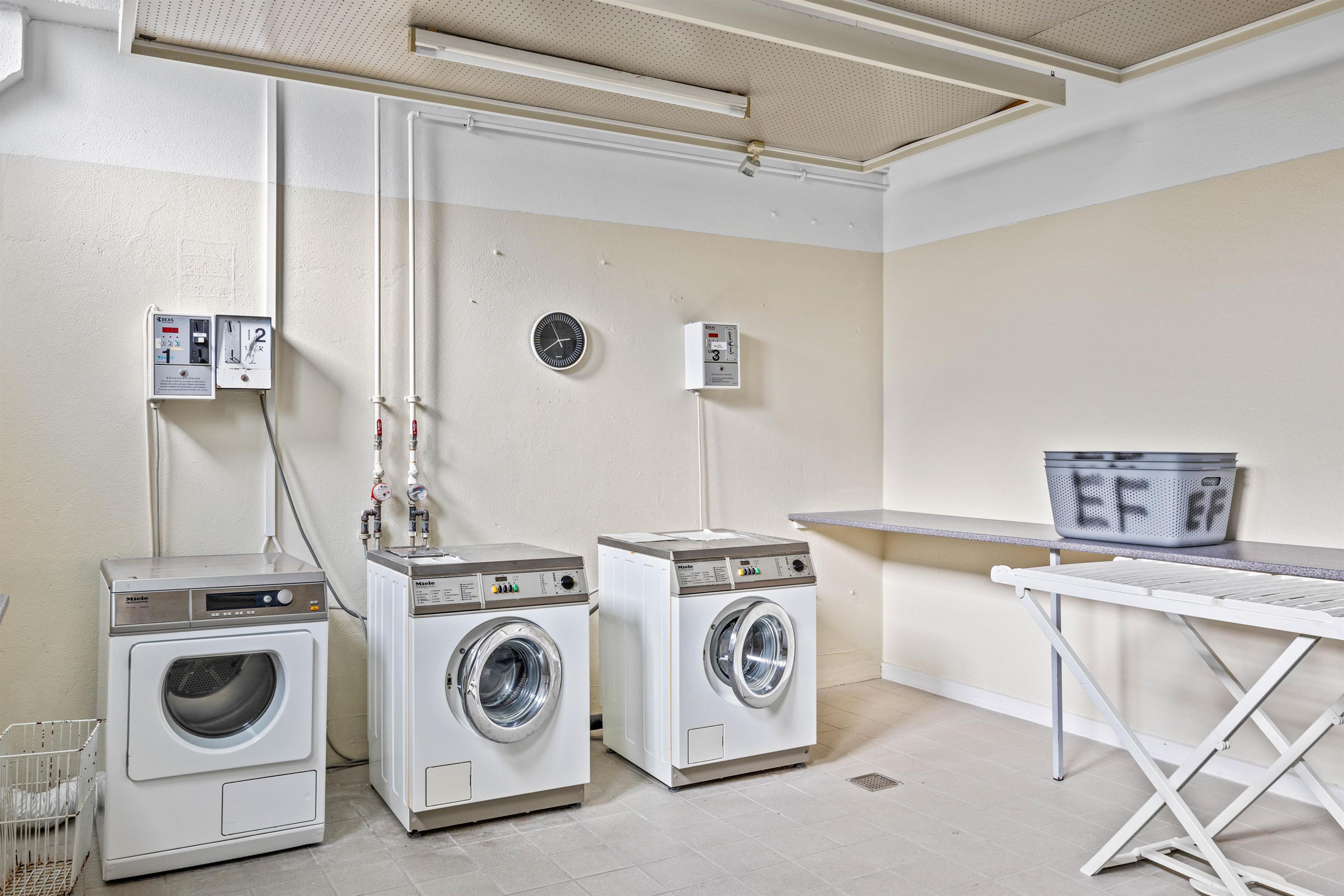 Der er indlagt gulvvarme i badeværelset med bruseniche, så ingen behøver at fryse om fødderne. Badeværelsest har også egen vaskemaskine.