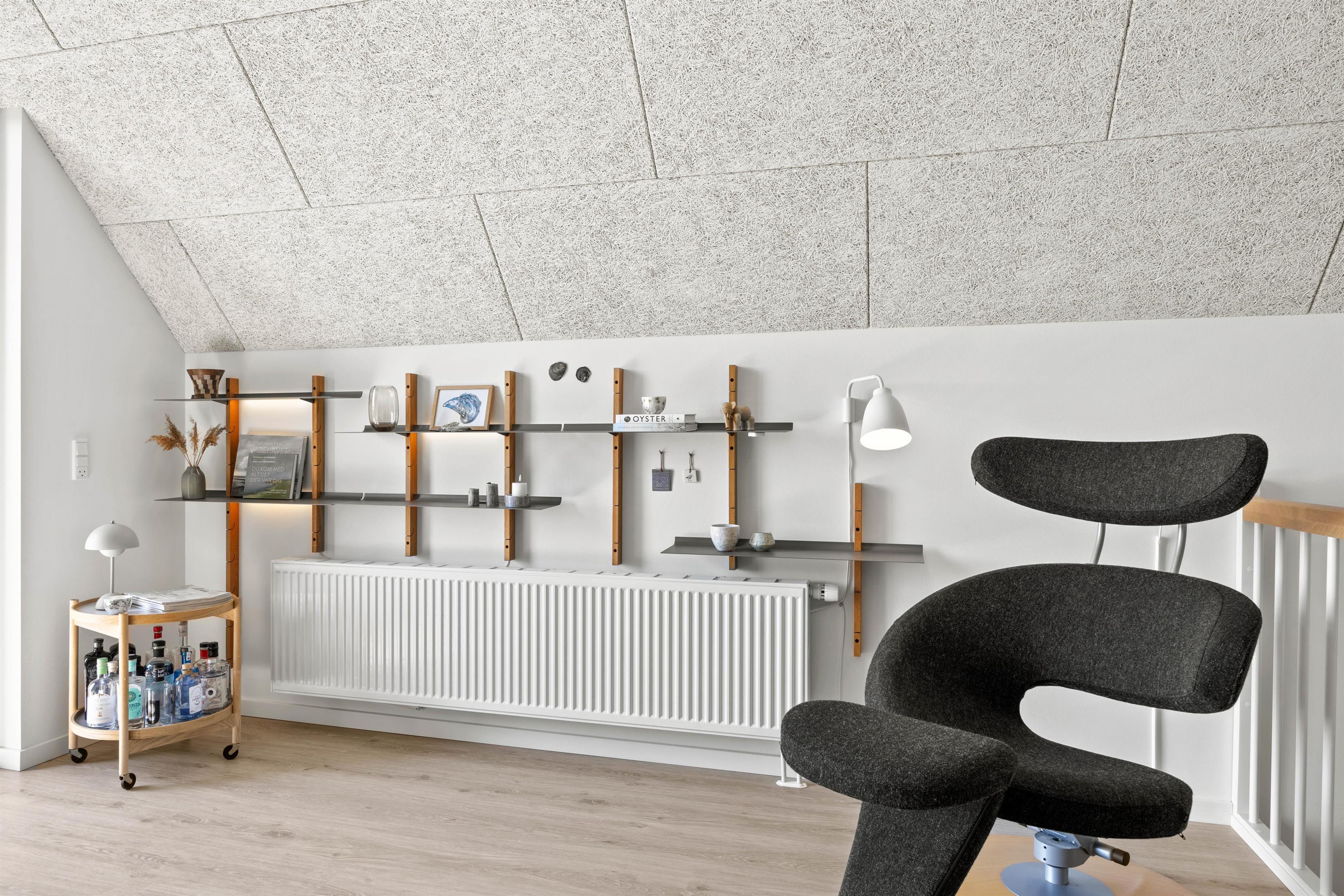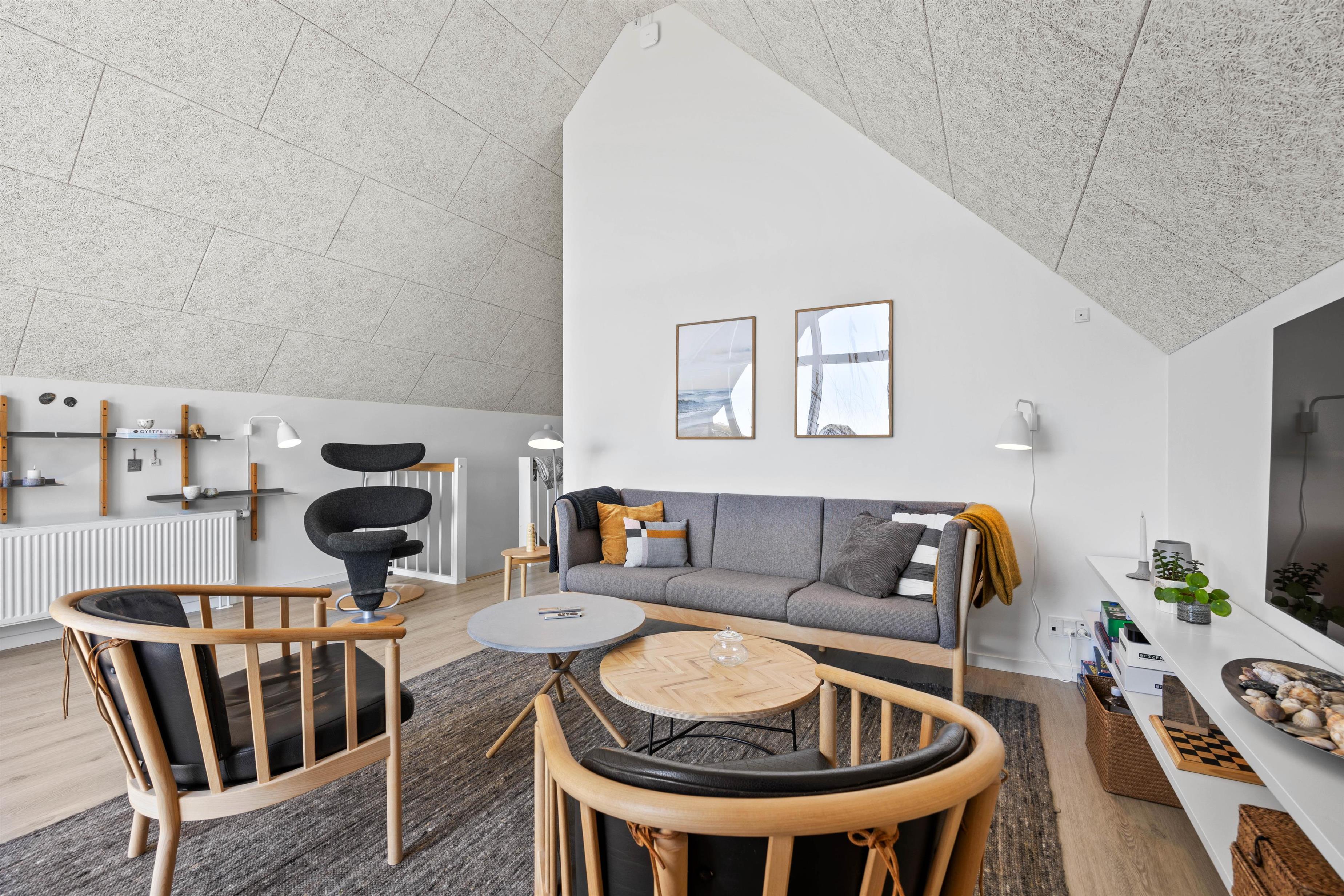 Opholdsstuen befinder sig på første sal, og er indrettet med rolige nuancer og bløde møbler, så I rigtigt kan slappe af og nyde aftenerne med en god film via Apple TV. Herfra har I ligeledes udgang til Balkonen, hvorfra I kan nyde den fantastiske udsigt udover Fanø Bad.