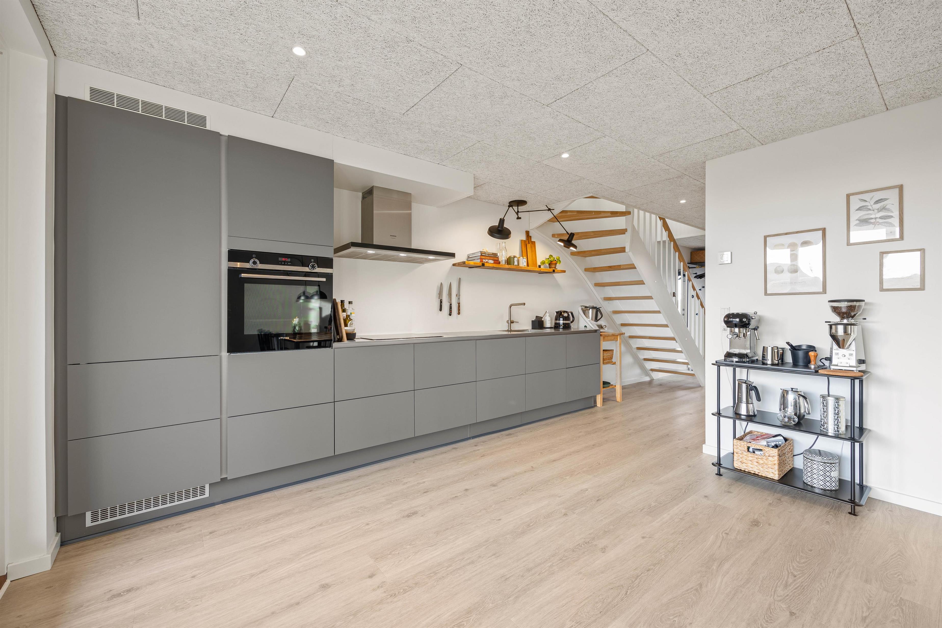 Feriehuset er indrettet i 2 etager med et boligareal på 112m². Her venter jer i stueetagen en rummelig spiseplads med smukt lysindfald samt et veludstyret køkken med opvaskemaskine der letter oprydningen efter madlavningen. Her er der god plads, så I sammen kan fremtrylle lækkerier. Her har I ligeledes god opbevaringsplads til jeres madvare, da køkkenet er udstyret med 60-liters fryseplads.