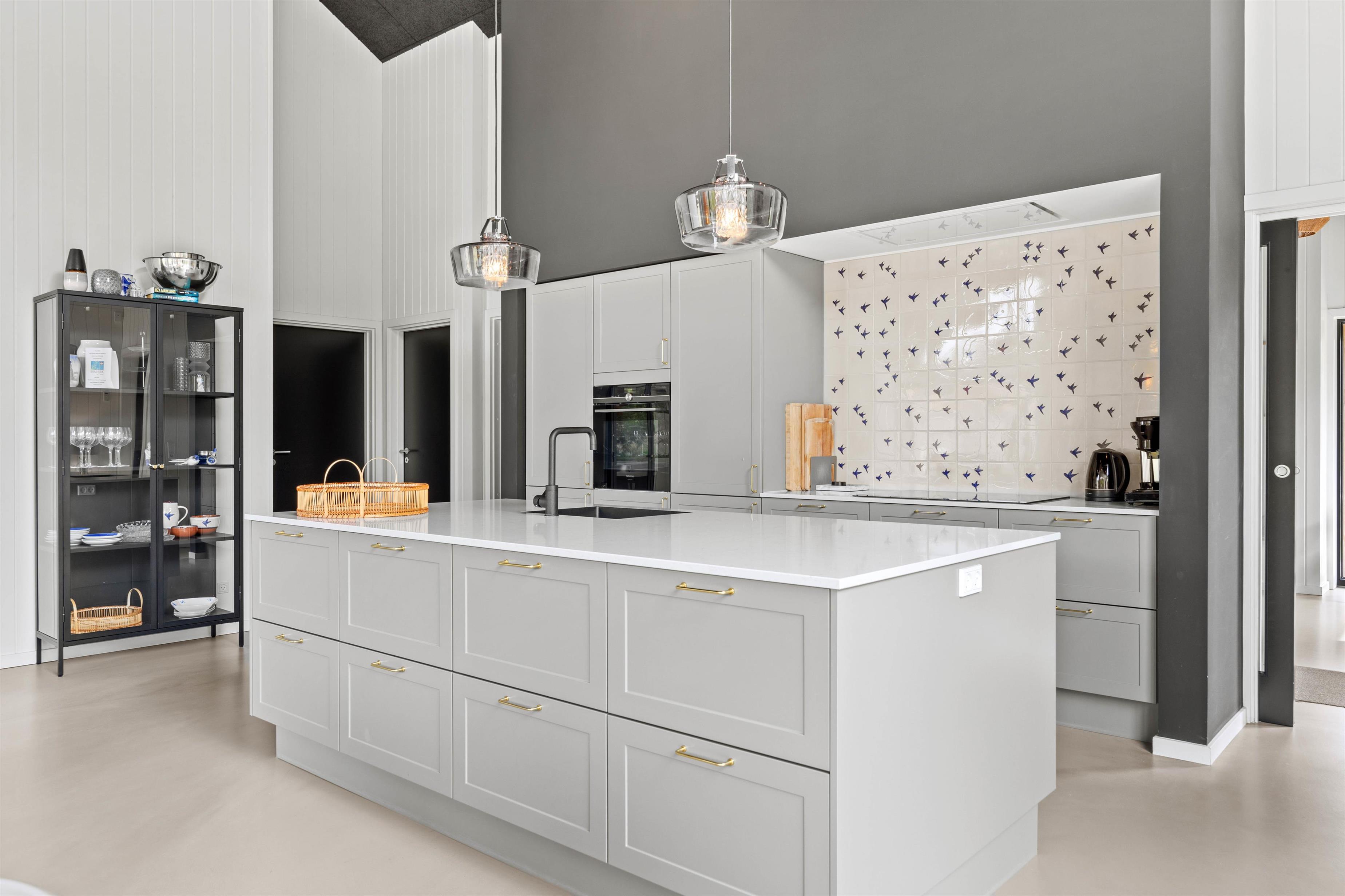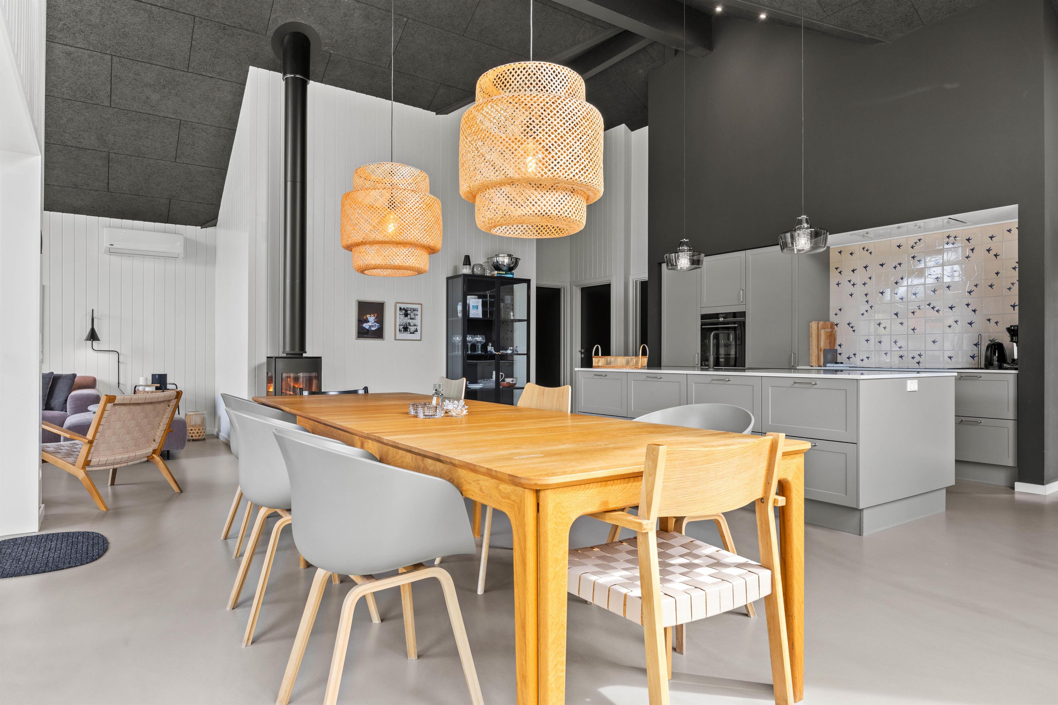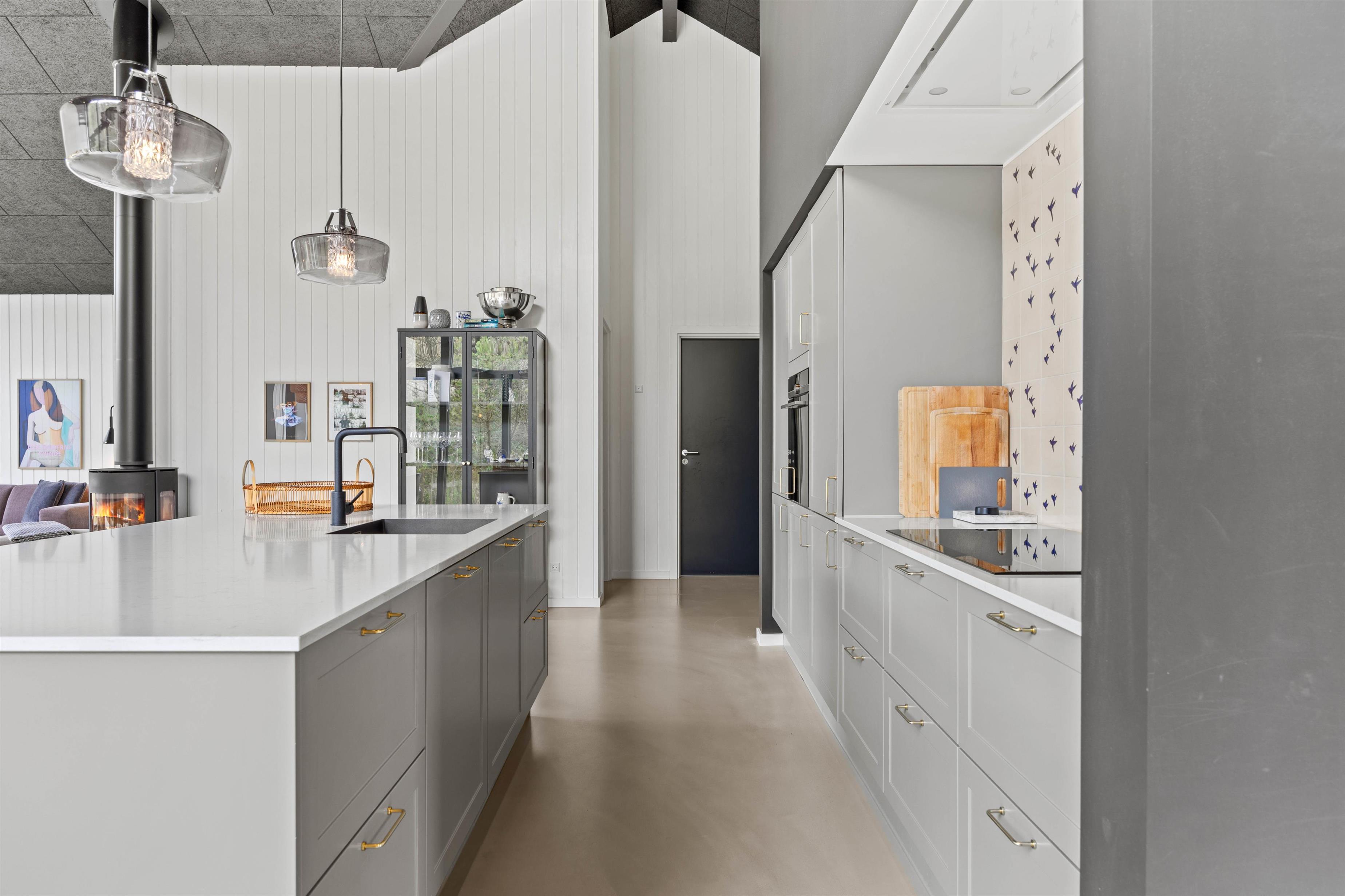 Det åbne plan med åbent opholds-spise-køkkenområde sætter fokus på samvær, og brændeovnen sætter prikken over i’et. Køkkenet indeholder alt, hvad I har brug for til et vellykket og godt måltid, herunder induktionskomfur, mikrobølgeovn og opvaskemaskine. Den energibesparende varmepumpe sikrer behagelige temperaturer i sommerhuset - hele året rundt.