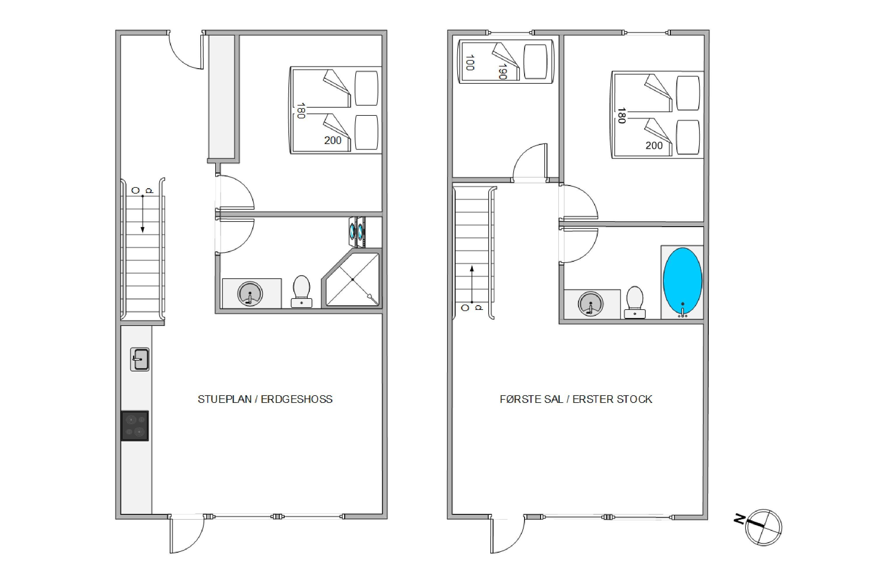 Førstesalen er indrettet med endnu et soverum med en 180x200 cm dobbeltseng samt børneværelse med 90x200 cm boksmadras og 90x190 cm køjeseng. Her finder I også et fint badeværelse med badekar. Hvem kunne ikke godt ligge her og dase efter en aktivitetsrig dag på Fanø? Takket være de 2 badeværelser, der begge er med gulvvarme, er dette feriehus også særligt egnet til en ferie med venner. Som et ekstra plus er der el-håndklædetørrer.