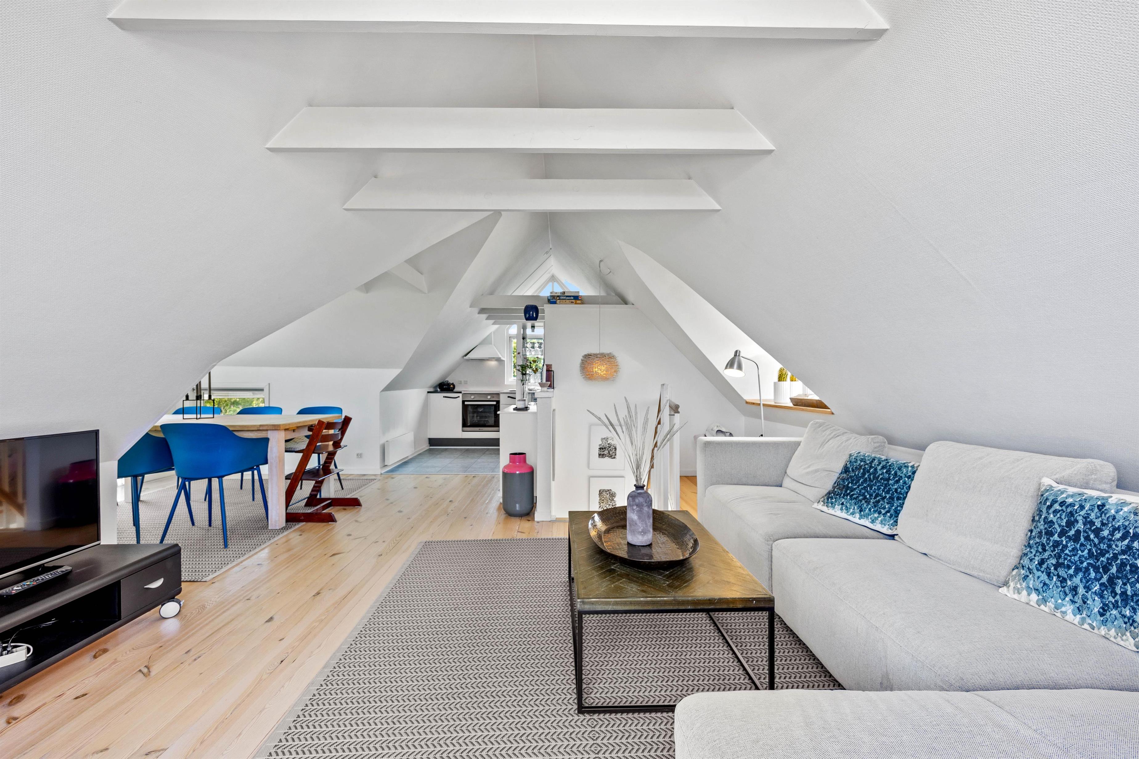 På øverste etage finder I det lyse åbne alrum, der forener stue og køkken. Her er god plads til familielivet. Her kan I lave mad sammen, spille brætspil eller noget helt tredje. Heroppe har I også direkte adgang til den dejlige balkon med udsigt over det omkringliggende område og golfbanen – et perfekt sted at nyde morgenkaffen.