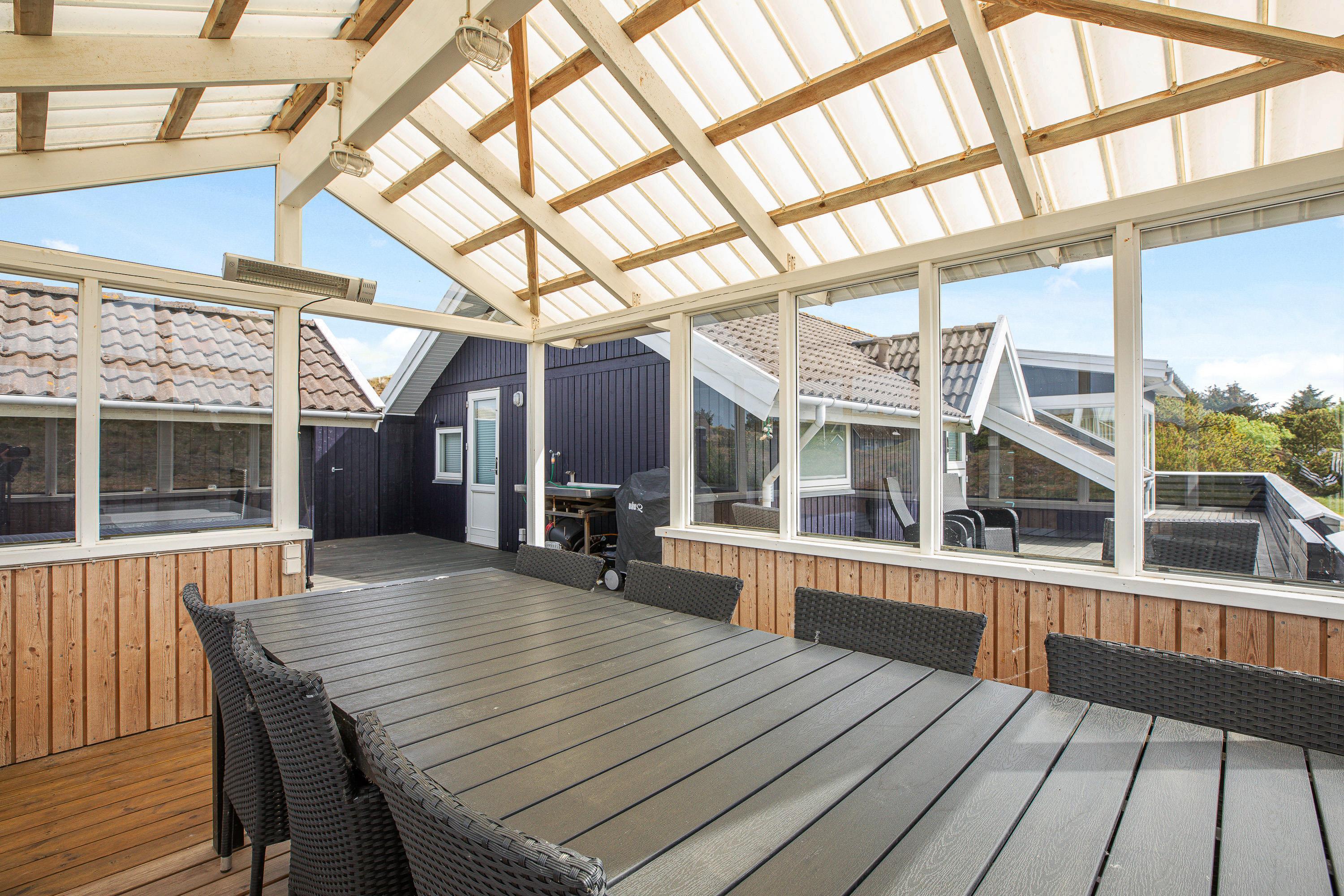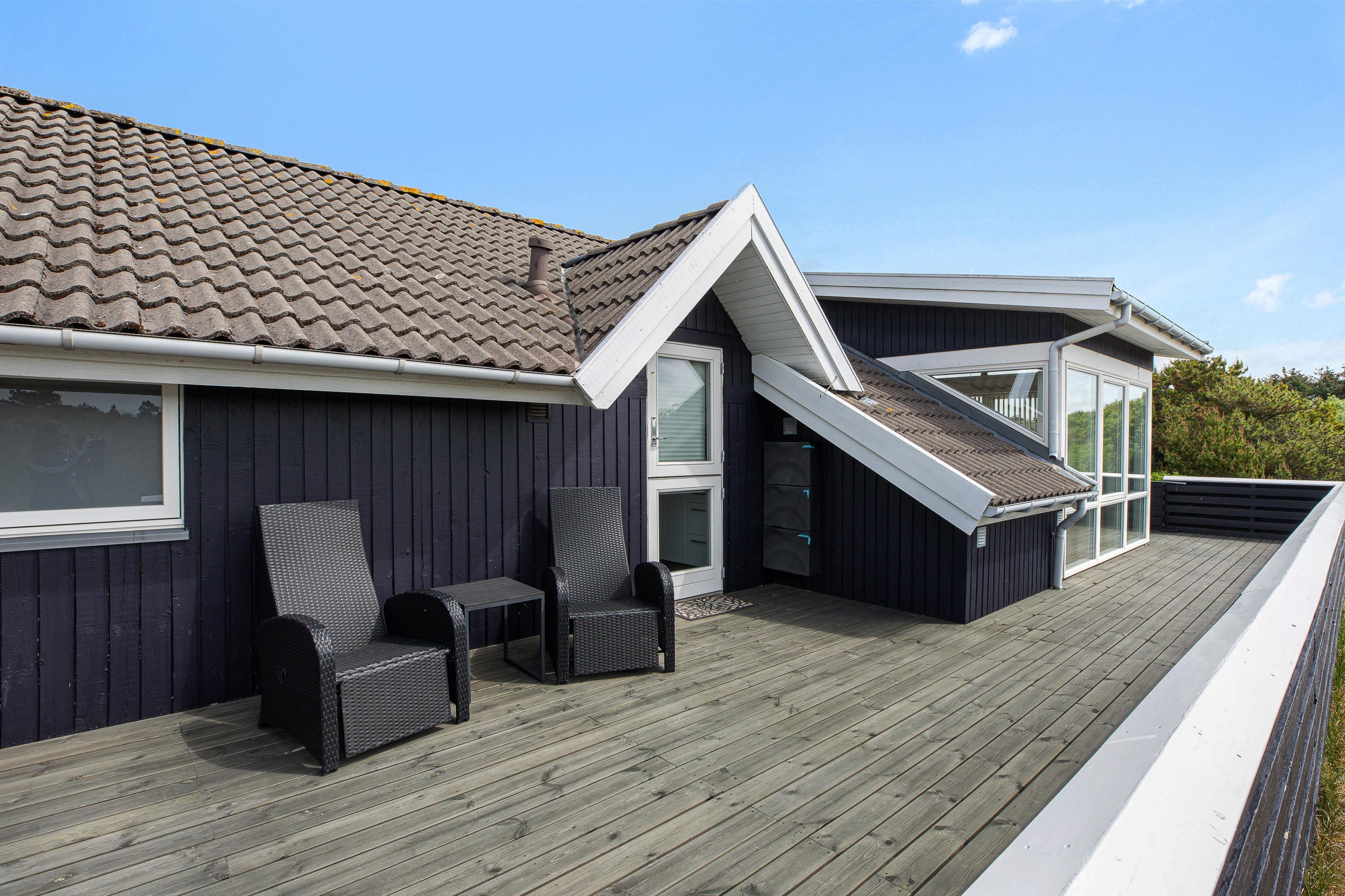 Den primære, aflukkede terrasse strækker sig langs 3 af feriehusets sider, så familiens mindste kan lege frit uden bekymringer. Med udgang fra den lukkede terrasse er der bag feriehuset på nordsiden indrettet en hyggelig terrasseplatform med udgang til sandkasse og legetårn med gynge og rutsjebane.