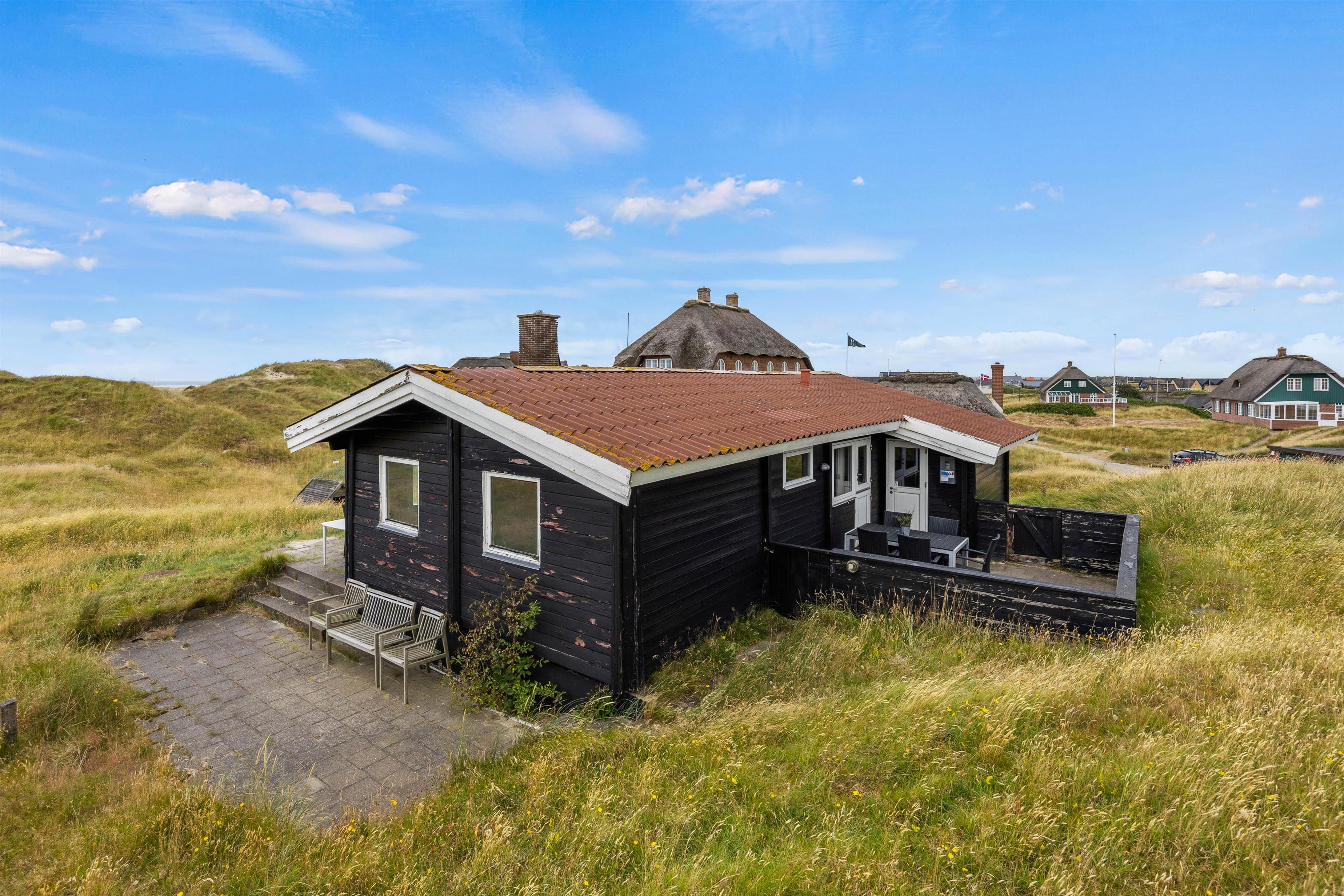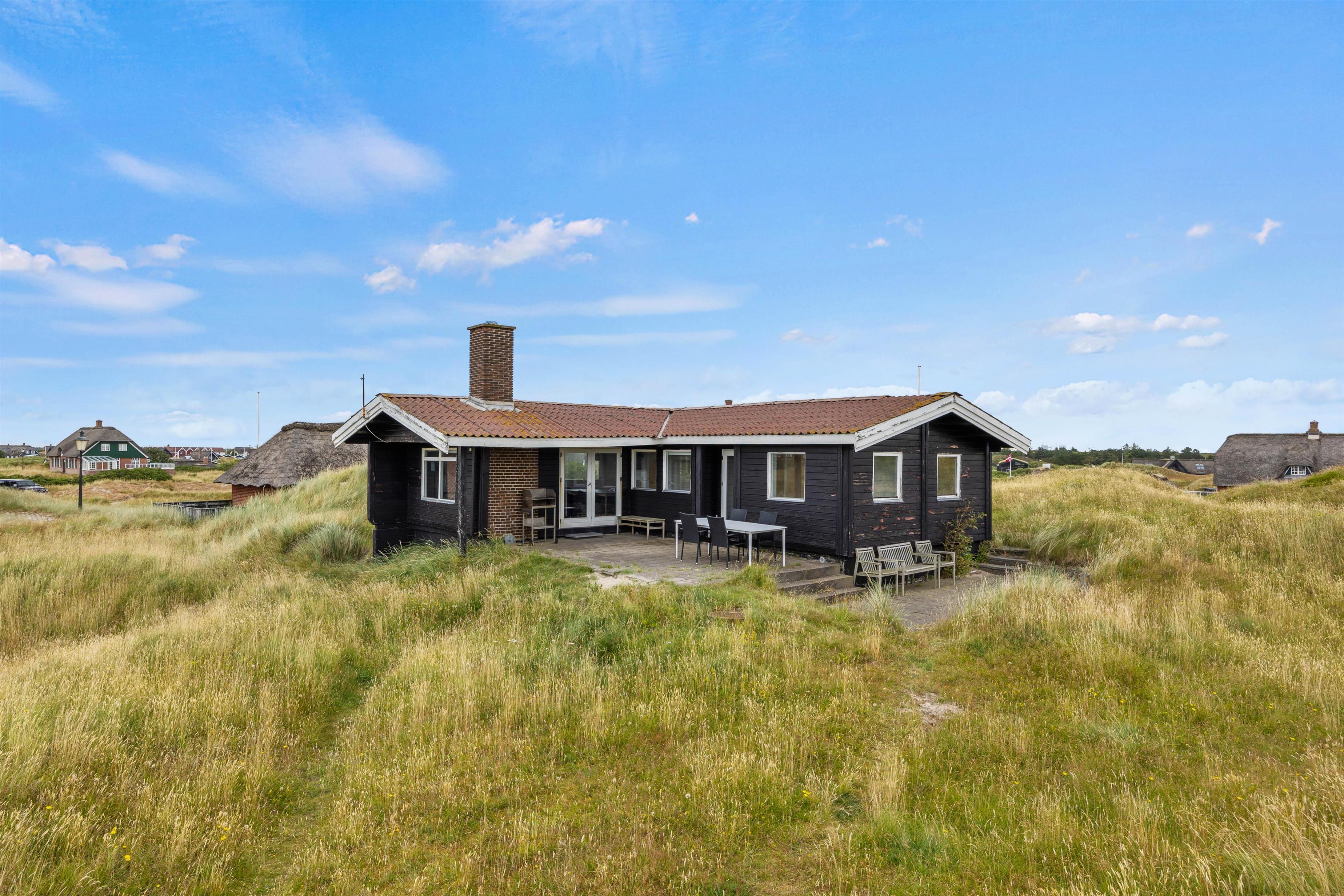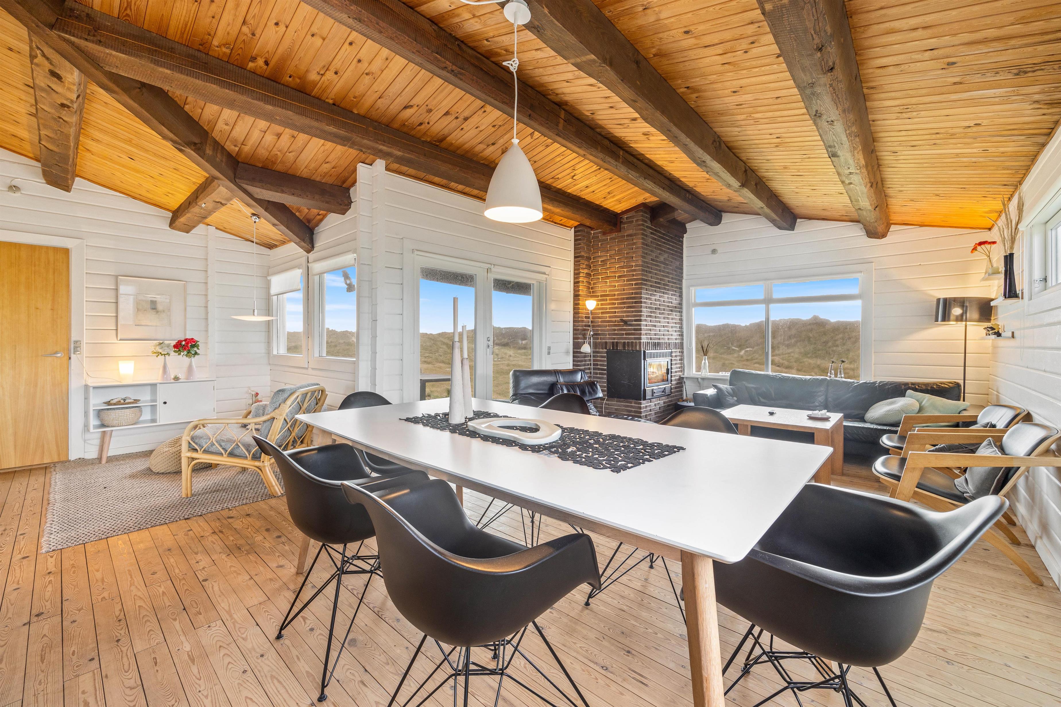 Det klassiske og rustikke træsommerhus med fritlagte bjælker og hvidmalede vægge byder på spisestue og et hyggehjørne ud i et, der er møbleret med sofa og hvilestole foran pejsen. Herfra kan I nyde naturen og klitterne lige udenfor gennem de store vinduespartier.