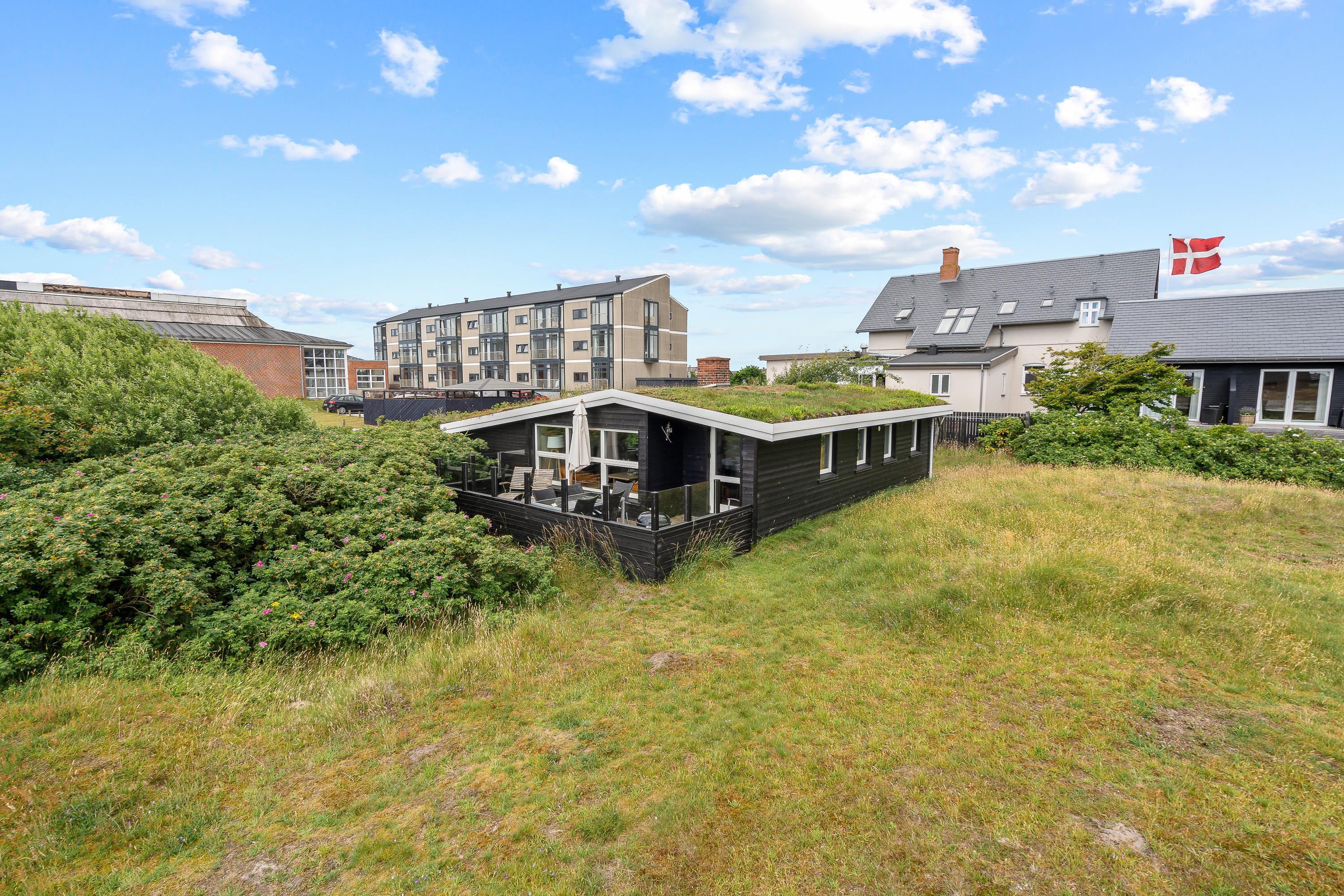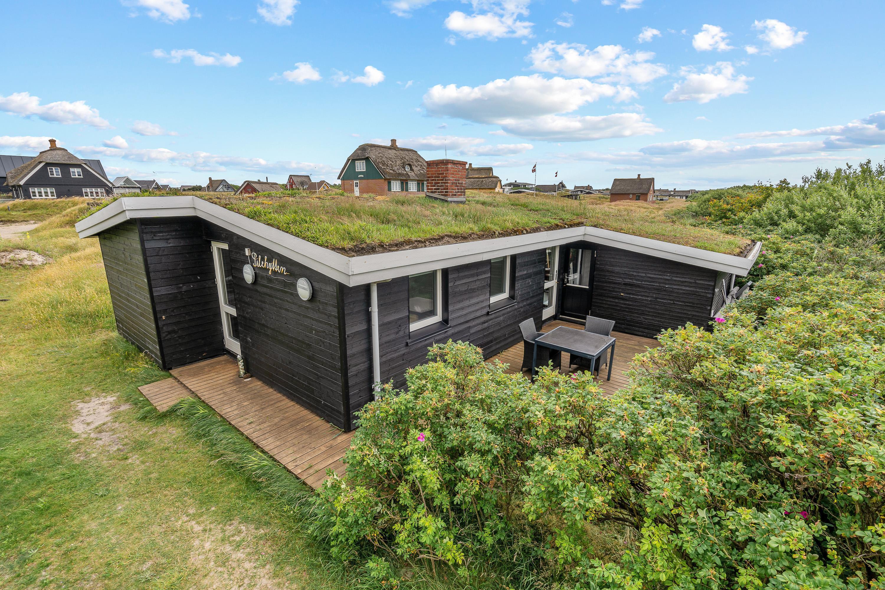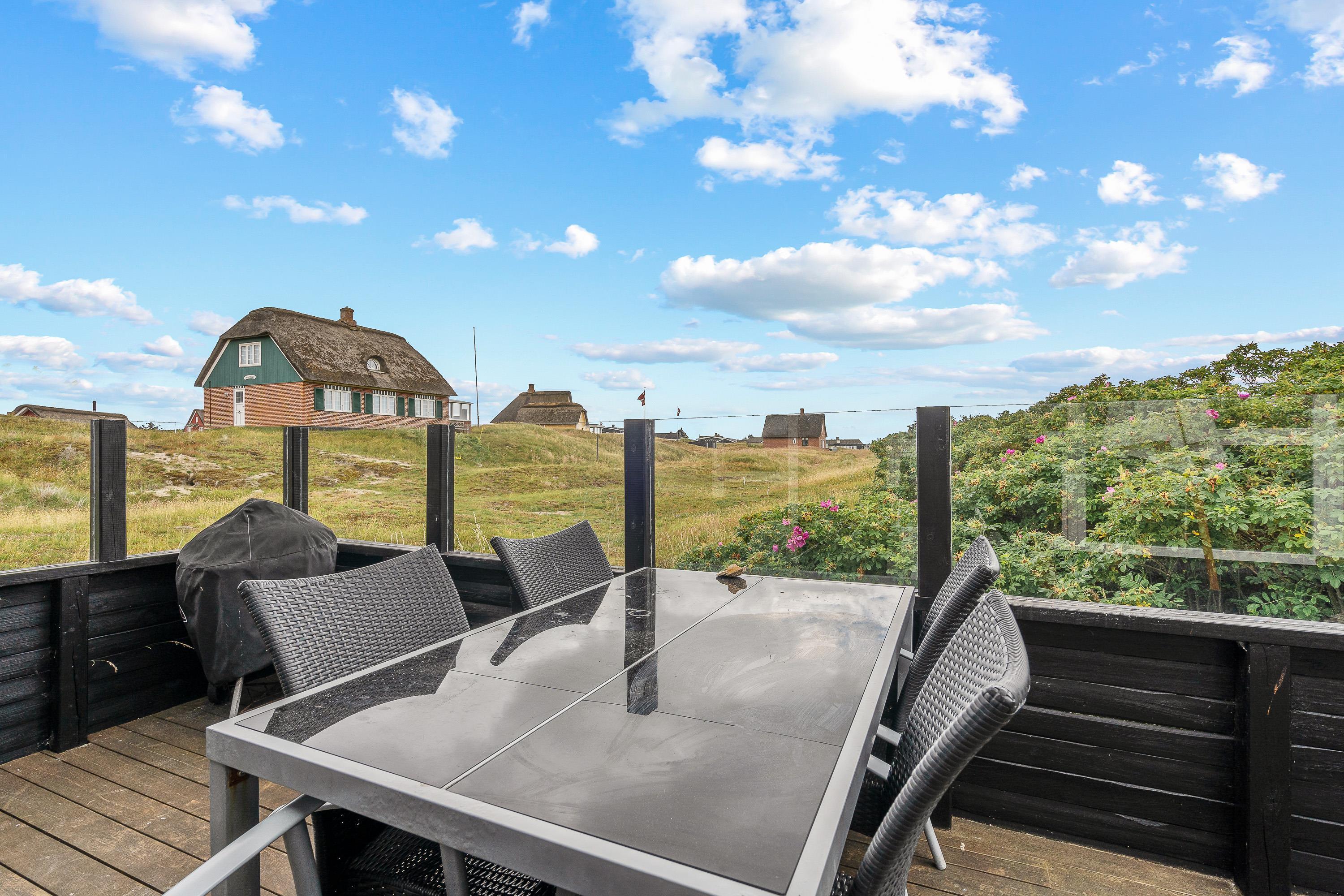 Med udgang fra opholdsstuen ligger en lille vestvendt terrasse godt gemt bag klitroser. Her kan I sidde ganske uforstyrret og nyde duften af klitroser og hav. Herfra har I også adgang til skuret, der indeholder vaskemaskine og tørretumbler.