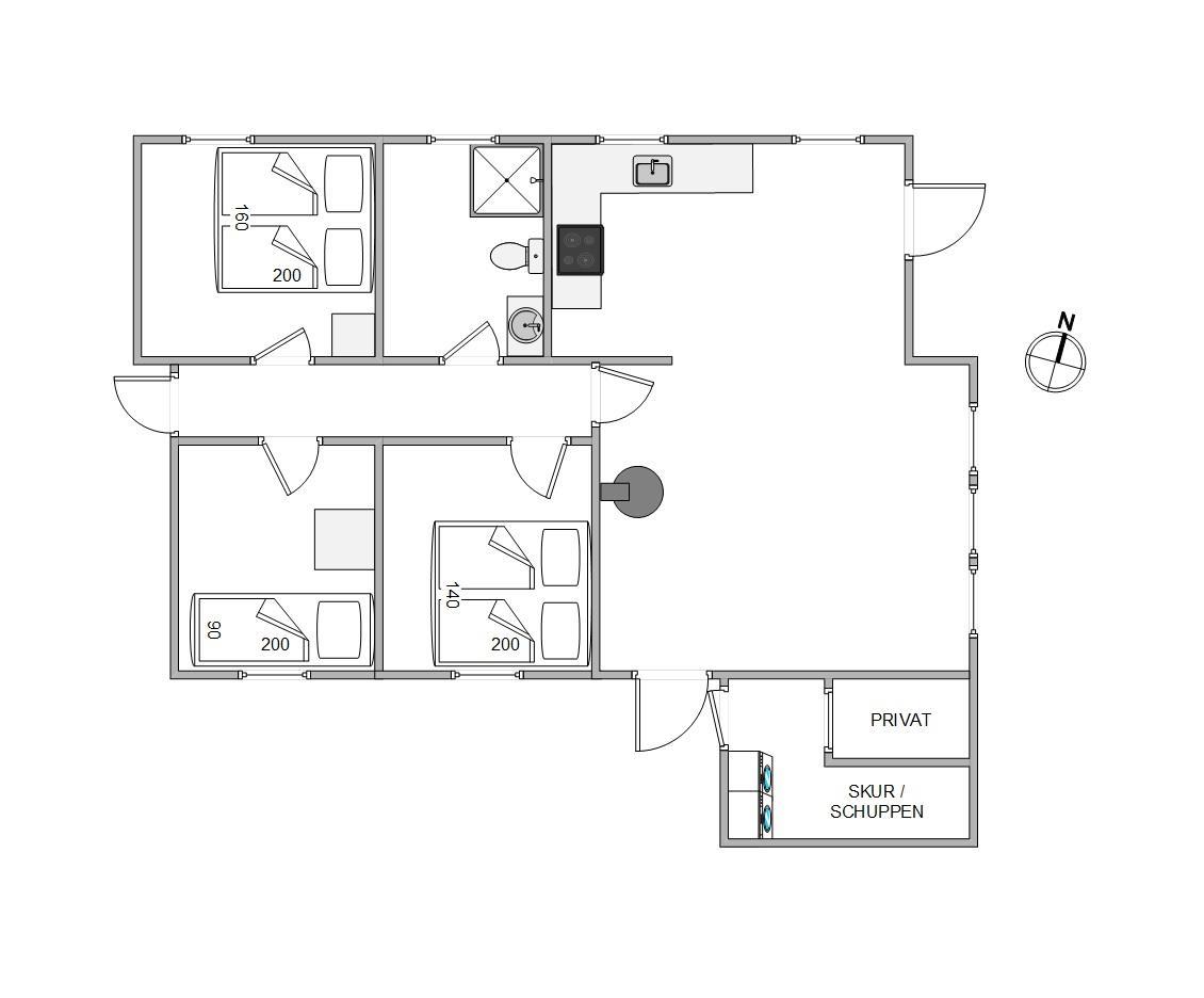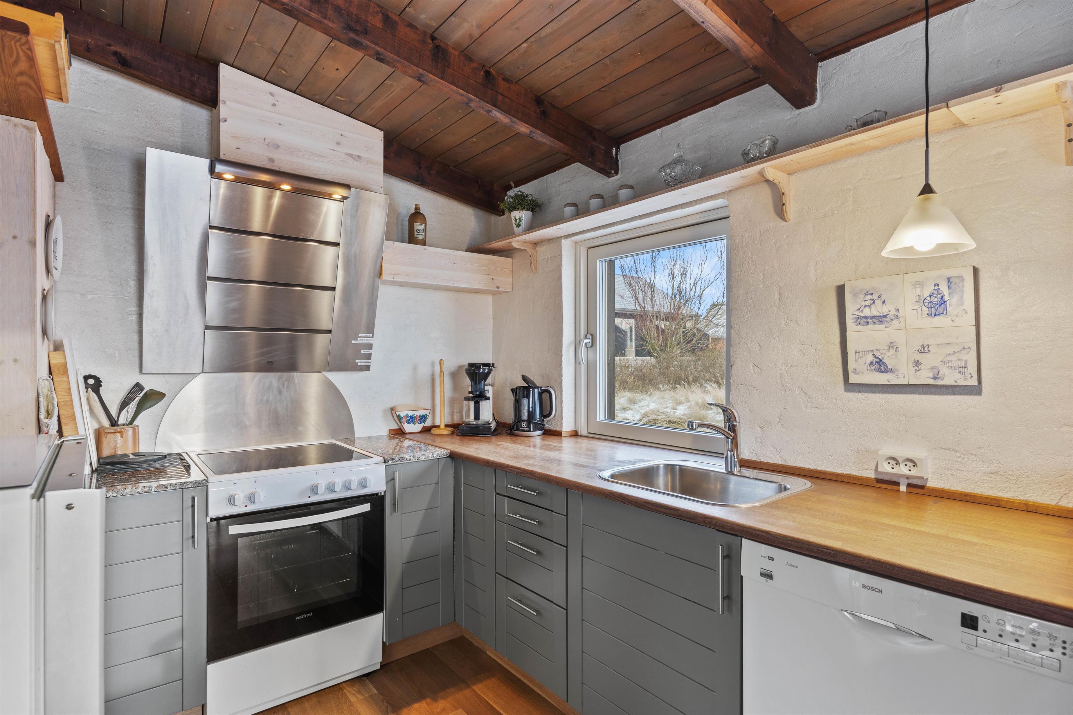 Det rummelige køkkenalrum indeholder et veludstyret køkken og spiseplads, i åben forbindelse til opholdsstuen. Her kan I læne jer tilbage i de komfortable møbler og nyde varmen og den sagte knitren fra brændeovnen i baggrunden. Feriehuset råder også over en moderne og energibesparende varmepumpe, der sørger for hurtig og effektiv opvarmning af feriehuset.