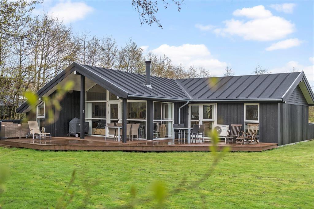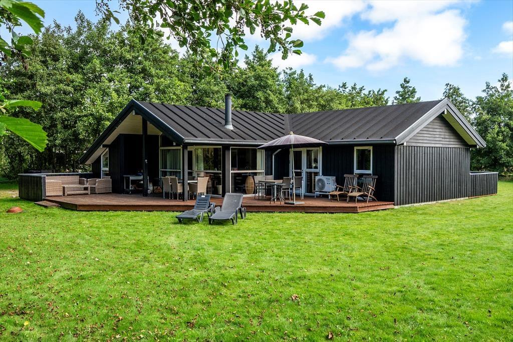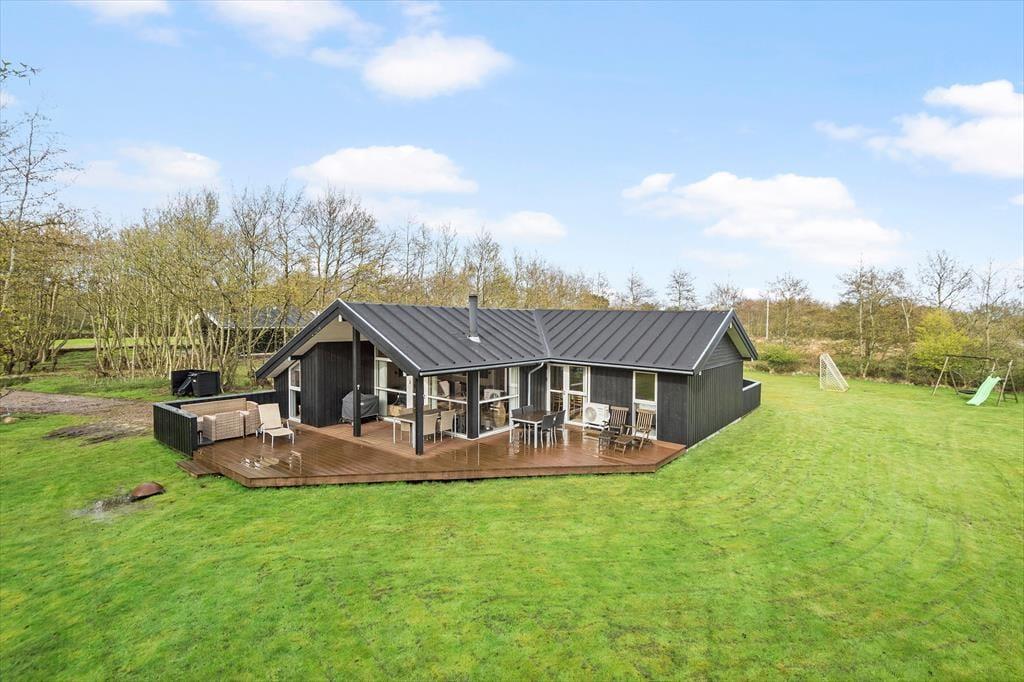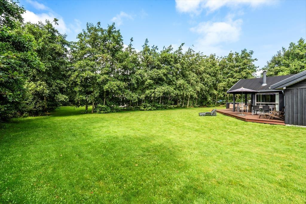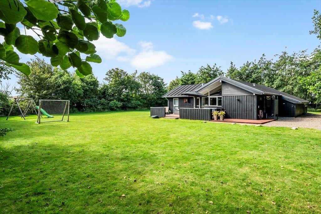 Lyder et morgenbad under åben himmel fristende? Det er lige, hvad du kan få, hvis du slænger et håndklæde over skulderen og går ud til terrassemiljøets udendørs bruser. Alternativt kan du nøjes med at brygge kaffe og tage en kop med ud i det fri for at nyde stilheden og solen, mens huset og omgivelserne vågner. Omkring sommerhuset er der flere gode opholdspladser, inklusiv overdækkede arealer, hvis du ønsker skygge om dagen eller ly for duggen om aftenen. Græsplænen er stor, så her er der masser af plads til at spille bold og slå kolbøtter, og de yngste børn har endda et legestativ med rutsjebane og sansegynge.