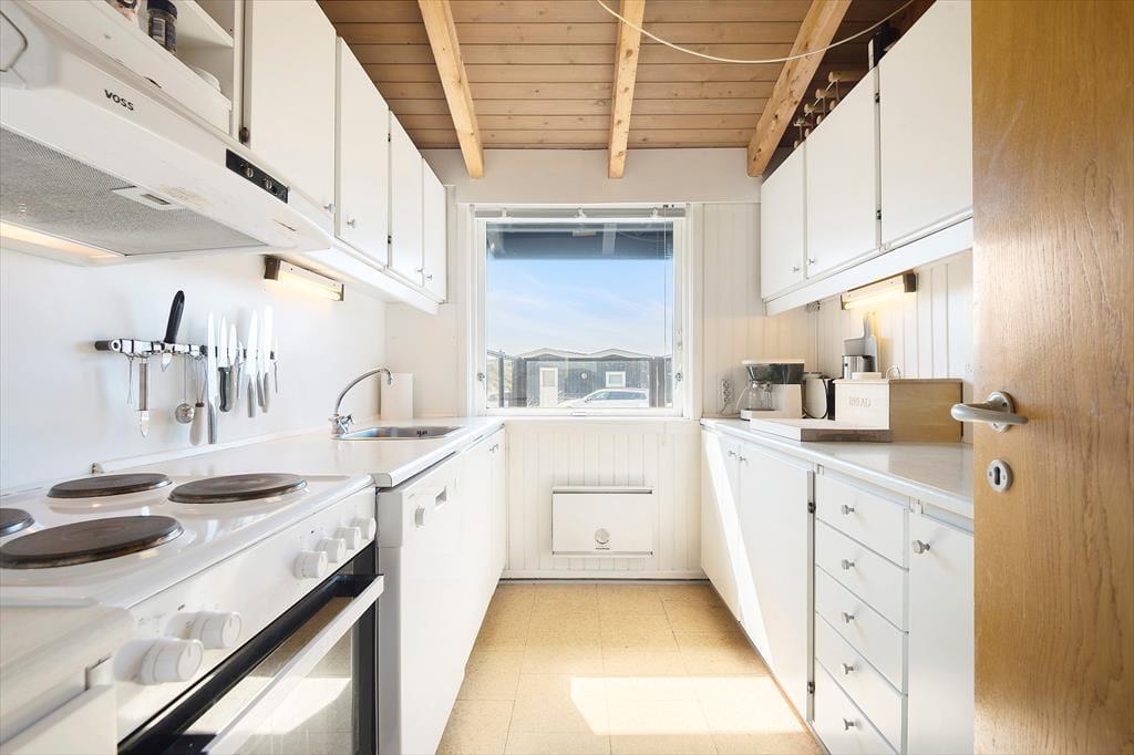 Sommerhuset emmer af ro og hygge, og lige fra du træder ind gennem hoveddøren, kan du mærke feriefreden sænke sig. Stuen har et rustikt look med markante bjælkekonstruktioner i loftet, og både pejsen og det komfortable møblement indbyder til, at du og dine kære tager dagene på helt tilbagelænet vis – for eksempel med varm kaffe i kopperne, gode bøger eller en spændende film på fladskærmen og Chromecast til streamning. Det tilstødende køkken er veludstyret, og som en charmerende detalje er der en lille luge ind til stuen, som du kan servere maden igennem. Soveværelser er der tre af, og planløsningen byder også på et brusebadeværelse, så i alt kan I være seks personer.
