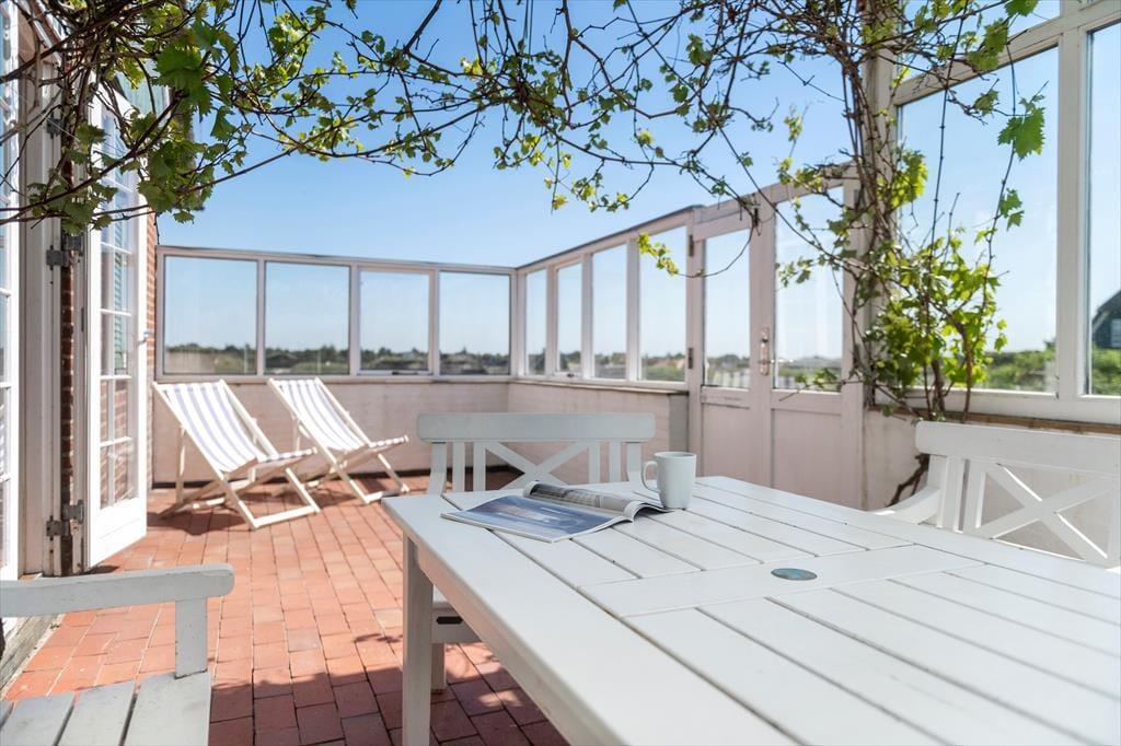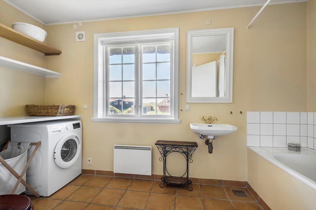 Fra køkkenet har du direkte adgang til en østvendt terrasse, så det er oplagt at tage kaffen med ud i dagens første solstråler, hvis du trænger til en stille stund, mens du for alvor vågner. Der ligger derudover en lidt større terrasse på husets sydside, og den er ikke bare aflukket, men også godt afskærmet, så den fungerer som en herlig oase – selv på dage med lidt vind og om aftenen, når det føles rart at flytte feriehyggen ind under et halvtag. For at gøre det hele endnu mere idyllisk, snor en vinplante sig under taget, og den må du selvfølgelig gerne hjælpe med at vande, så vinen kan trives mange år endnu i de smukke kystomgivelser.