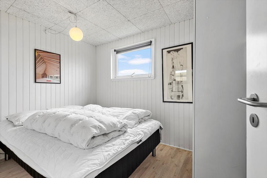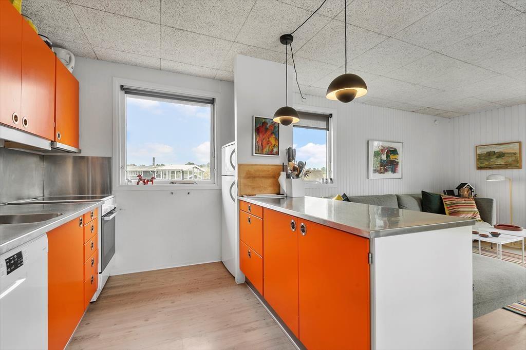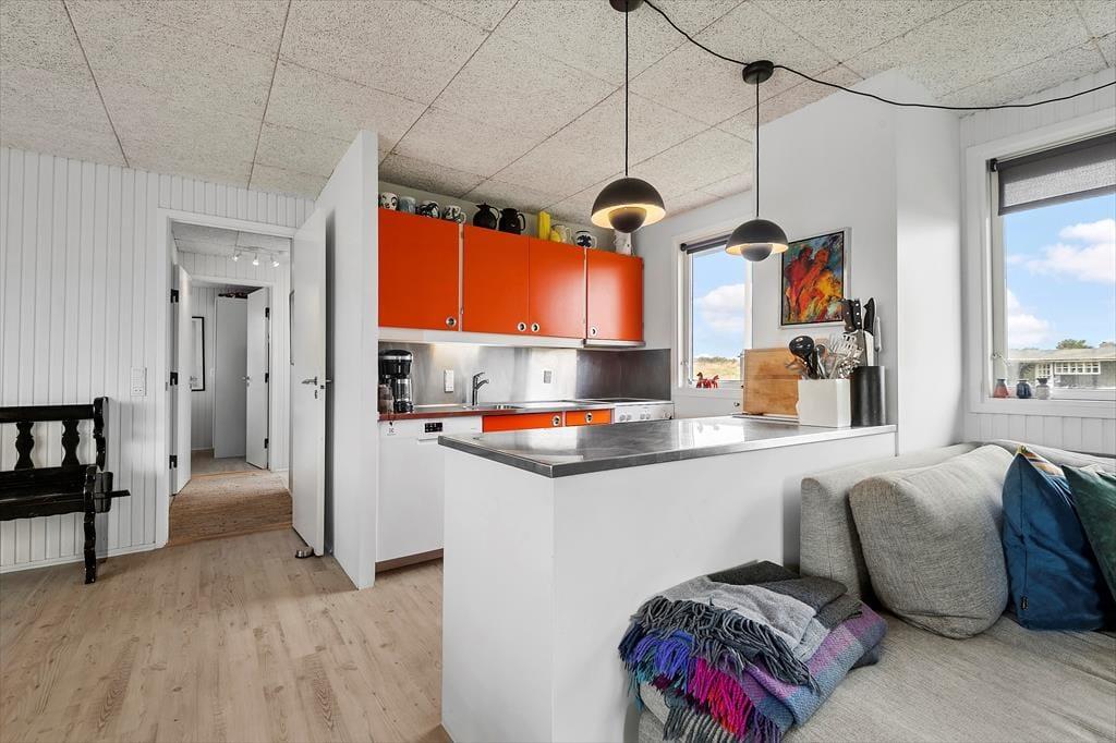 Inde i huset er der tre hyggelige soveværelser til rådighed, så uanset om du har familie eller venner med på ferie, har alle udsigt til at få en god nattesøvn. Det enkle brusebadeværelse er holdt i lyse farvetoner, og det samme gør sig gældende for opholdsrummet – dog med et skønt farveskær fra det retrosmarte køkken og fra andre detaljer i interiøret. Stuen er indrettet med sans for hyggestunderne, så du og dine kære hurtigt kan føle jer hjemme, uanset om I samles til brætspil og gode samtaler, eller om det er tid til at slappe af med en god bog eller en podcast i ørerne.