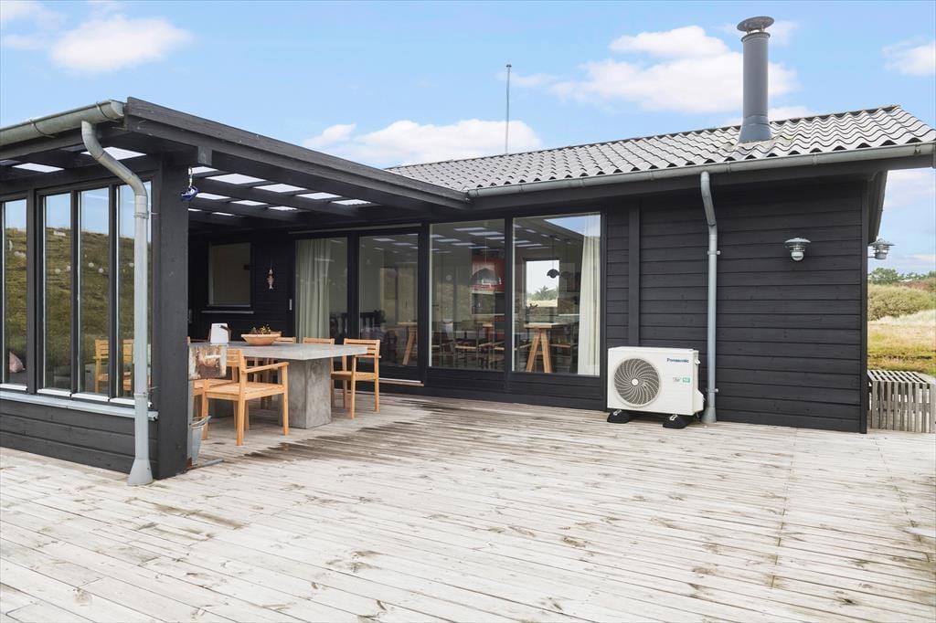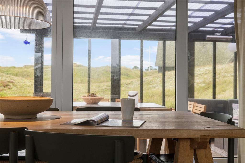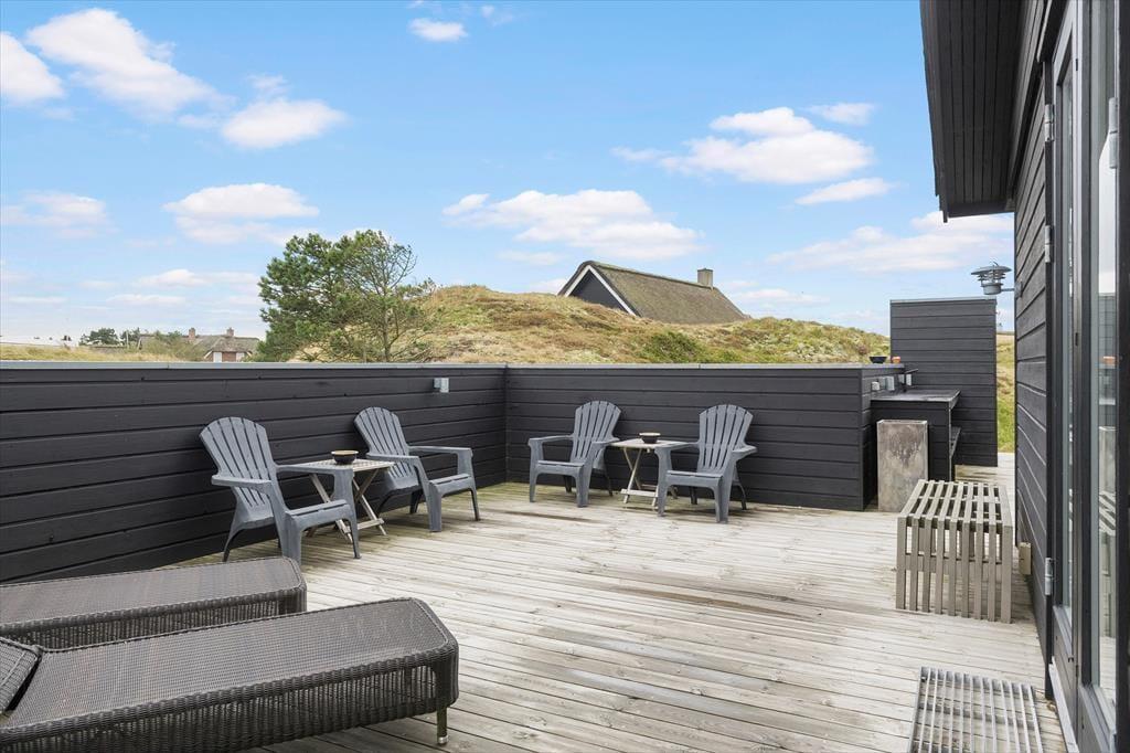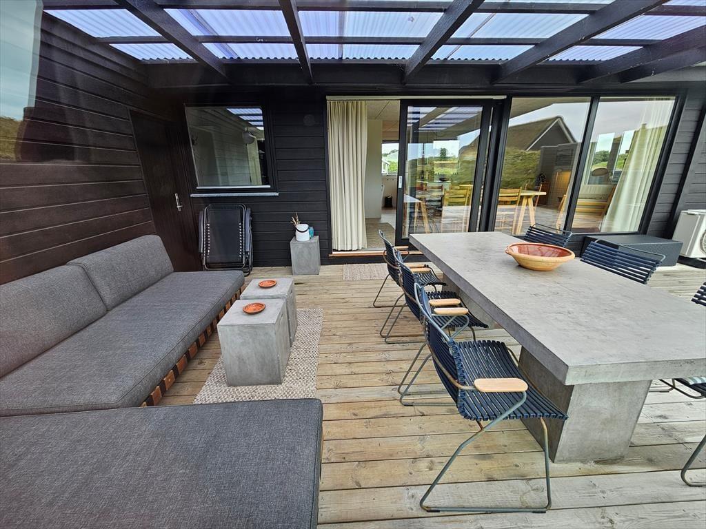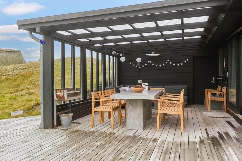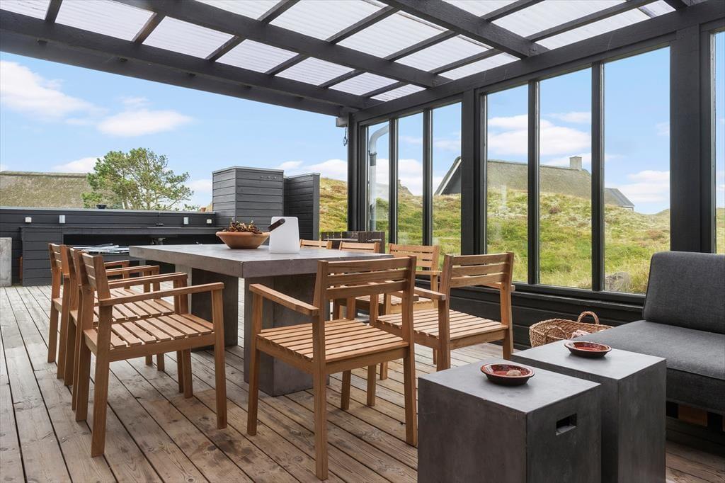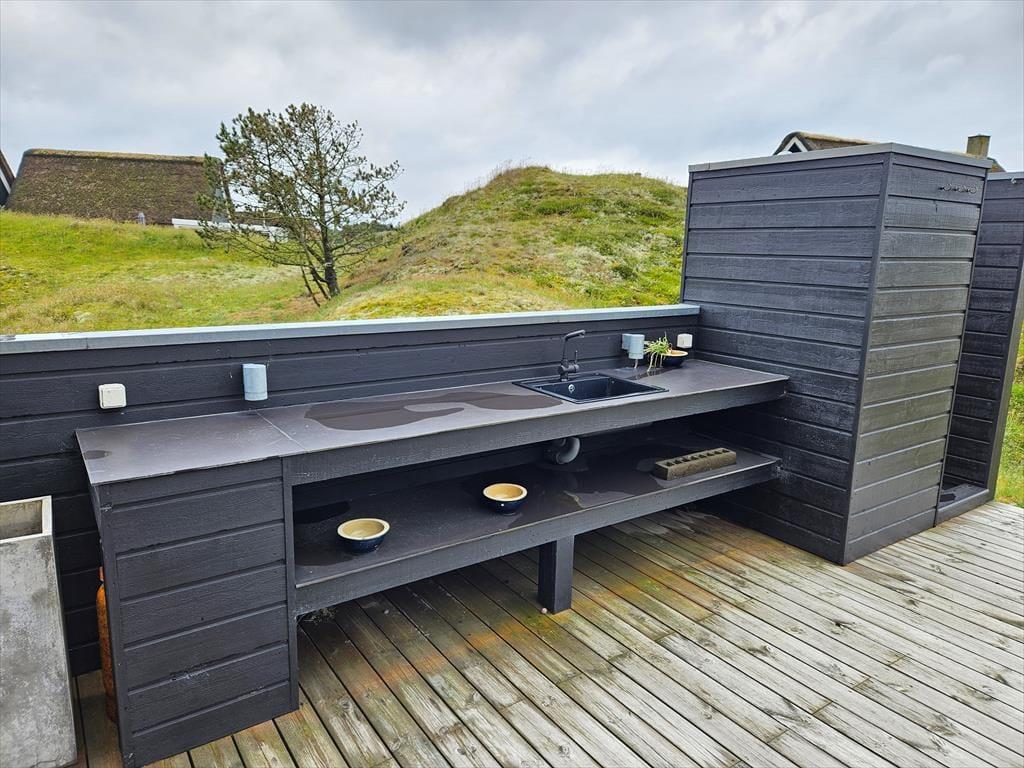 Sommerhusets moderne terrassemiljø breder sig over 120 m2, og her får du rig mulighed for at nyde sommerlivet i stort set al slags vejr. Der er mange solkroge og godt afskærmede opholdspladser at vælge imellem, og hvis en lille byge passerer forbi, er det herligt at sidde på den overdækkede terrasse, som er indrettet med både loungehjørne og havebord. Udsigten til klitterne er betagende – også når du træder ud fra den udendørs bruser, eller når du står og tryller med de lokale råvarer ved det lækre udekøkken.