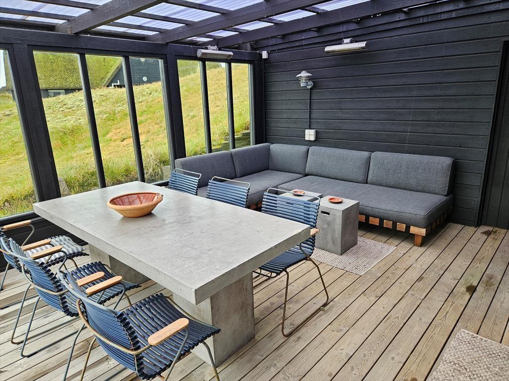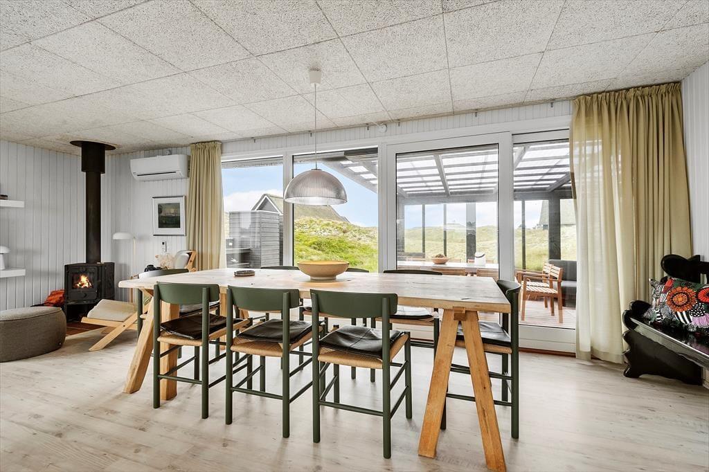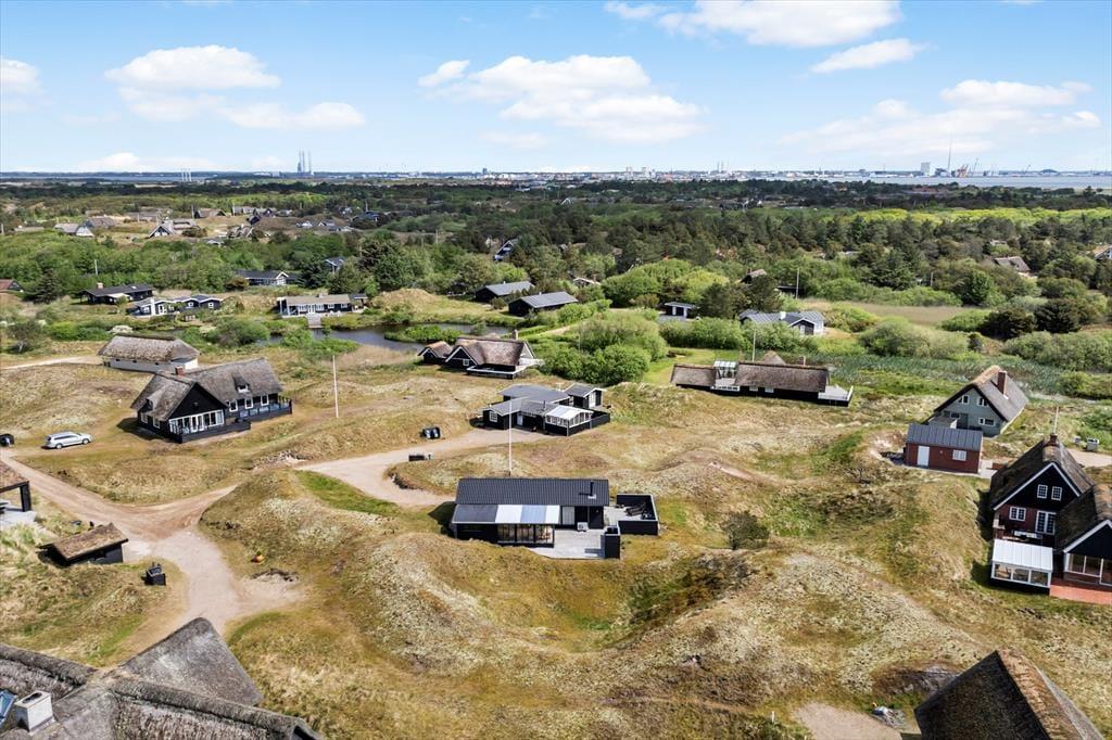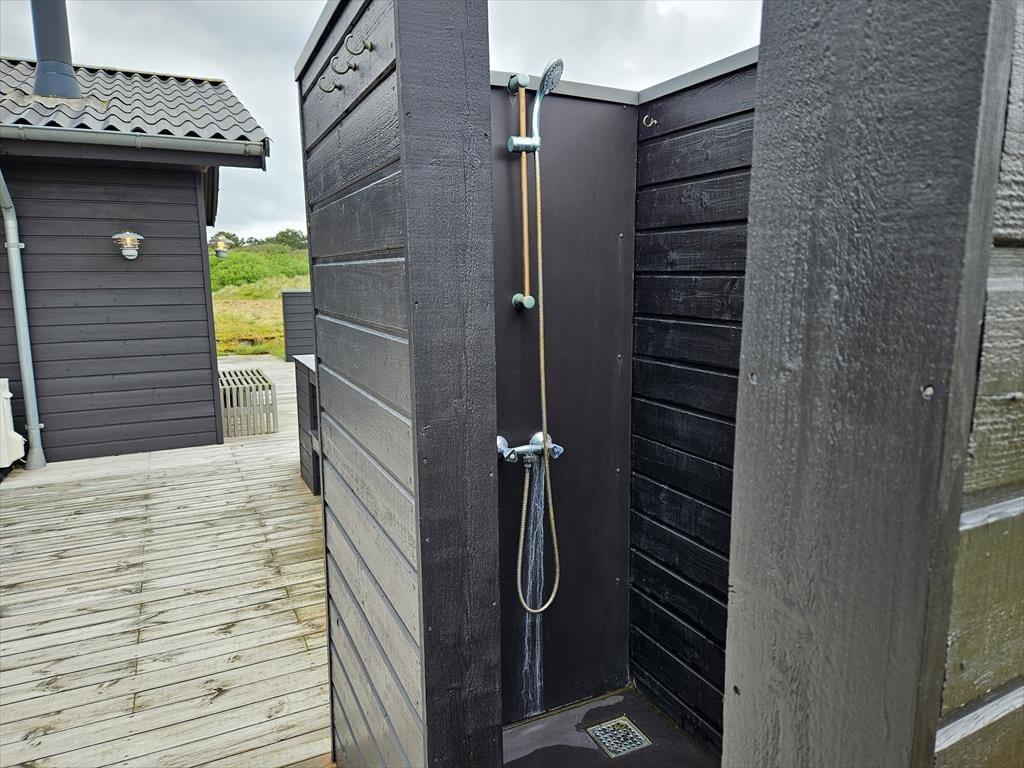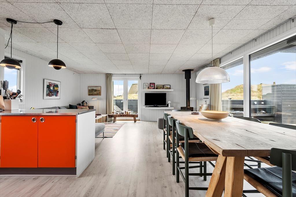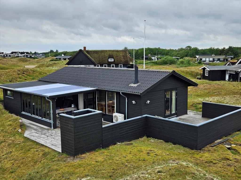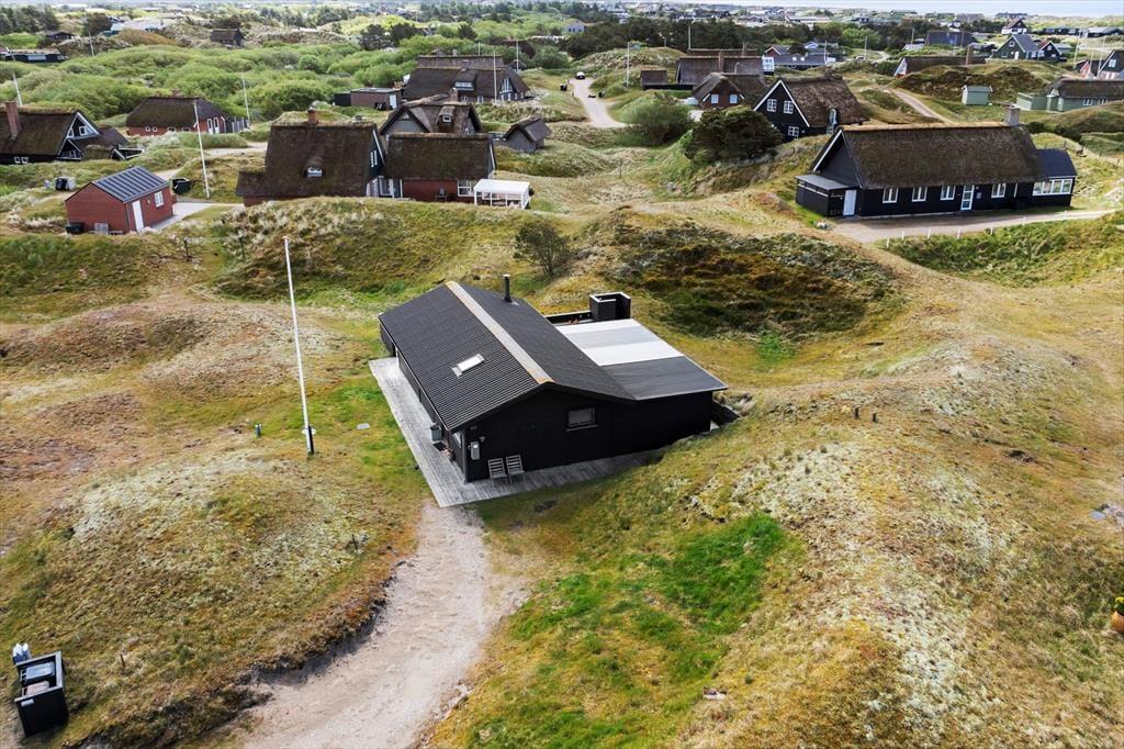 Sommerhusets moderne terrassemiljø breder sig over 120 m2, og her får du rig mulighed for at nyde sommerlivet i stort set al slags vejr. Der er mange solkroge og godt afskærmede opholdspladser at vælge imellem, og hvis en lille byge passerer forbi, er det herligt at sidde på den overdækkede terrasse, som er indrettet med både loungehjørne og havebord. Udsigten til klitterne er betagende – også når du træder ud fra den udendørs bruser, eller når du står og tryller med de lokale råvarer ved det lækre udekøkken.