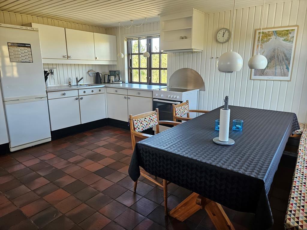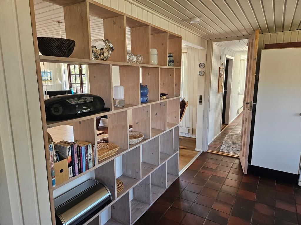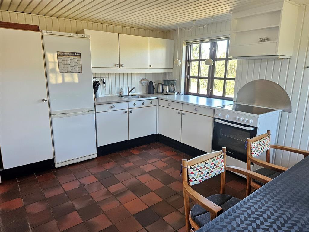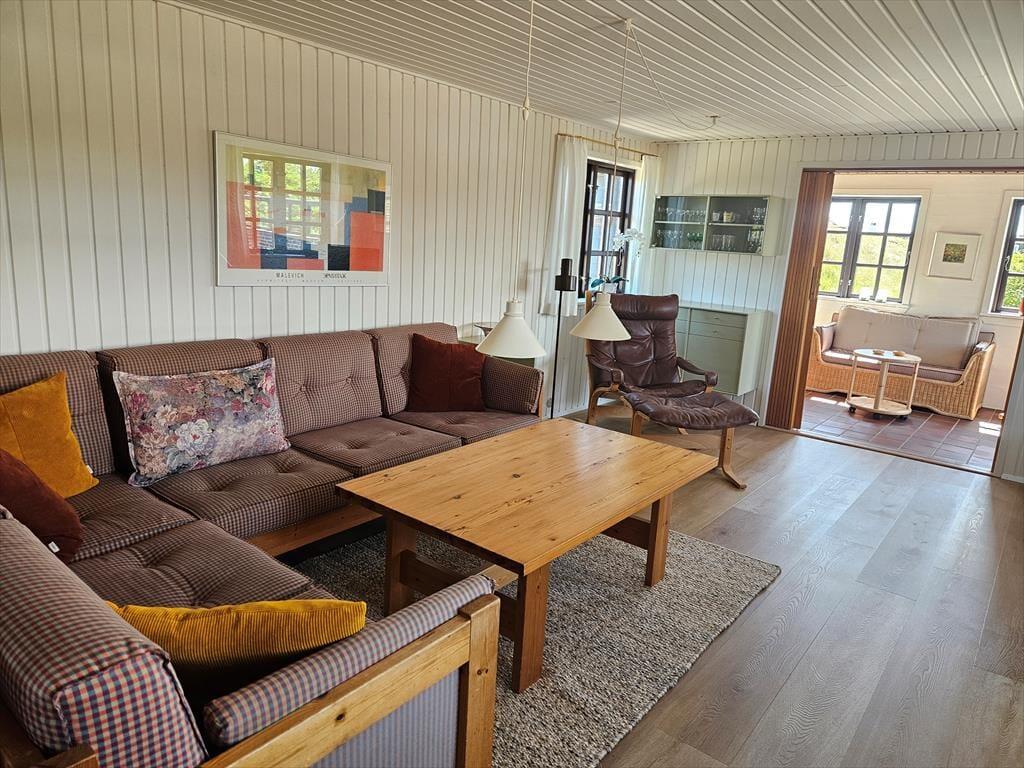 Indenfor mødes du af en lys og enkel indretning, hvor alt emmer af afslappet sommerhusidyl. Den hyggelige stue fungerer som husets samlingspunkt, og her kan du læne dig tilbage i sofaen, mens snakken går, eller nyde en stille stund med en god bog. Køkkenet er praktisk indrettet og ligger i åben forbindelse med opholdsrummet, så feriens måltider kan tilberedes uden at afbryde hyggen. De store vinduespartier lader solen skinne ind og giver en varm og rar atmosfære i hele rummet. Stemningen er gennemført sommerhusagtig – lige præcis den slags rammer, der gør det nemt at finde ferieroen og komme hinanden ved.