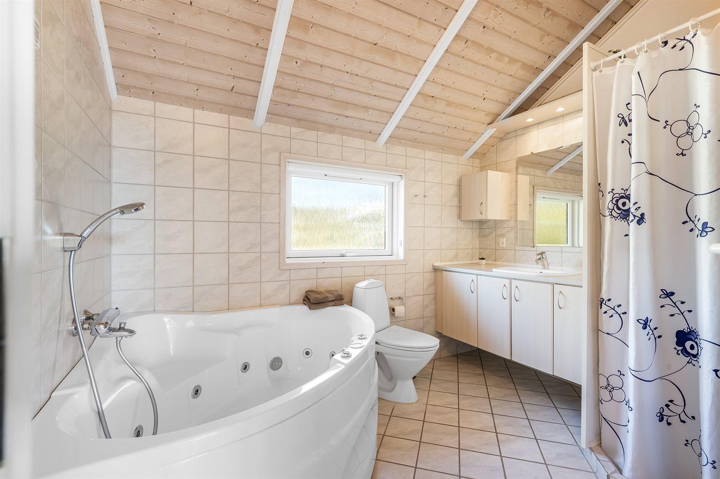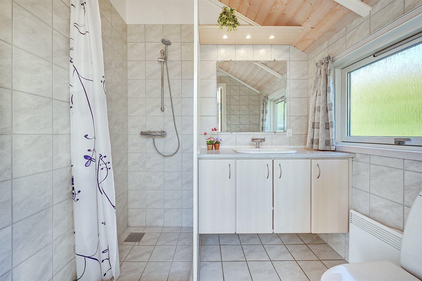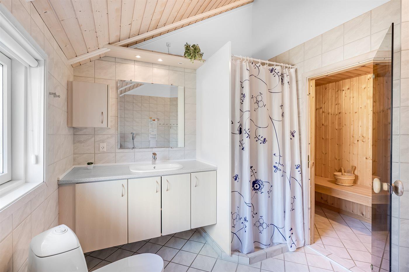 Der er 2 badeværelser med bruseniche og 2 toiletter. Der er gulvvarme på de 2 badeværelser. Håndklædetørrer. I saunaen er der mulighed for afslapning.