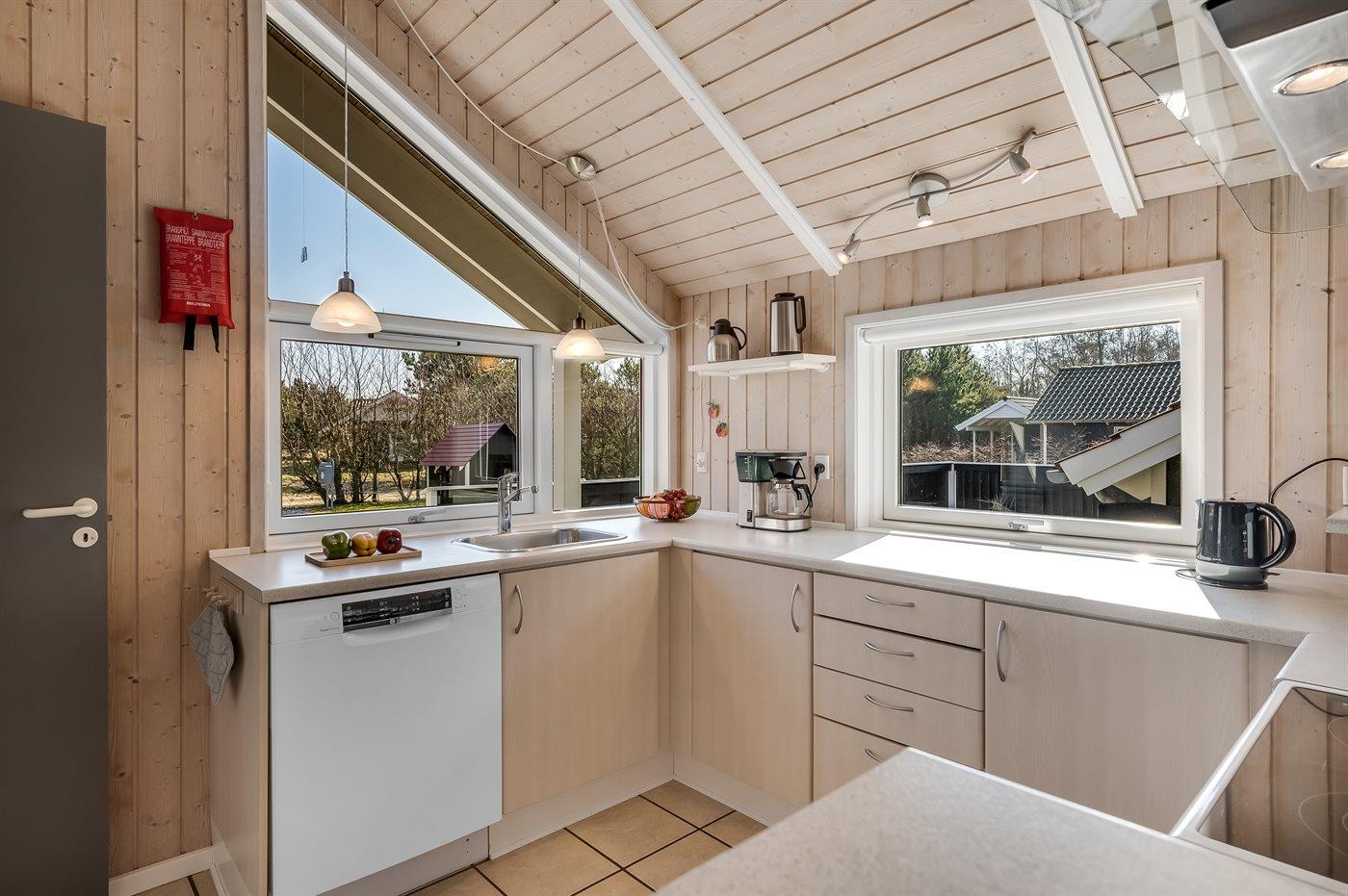 Køkkenet er veludstyret og med energivenligt køle- og fryseskab. Der er 4 keramiske kogeplader, varmluftsovn, mikrobølgeovn samt opvaskemaskine. Køkkenet har gulvvarme.