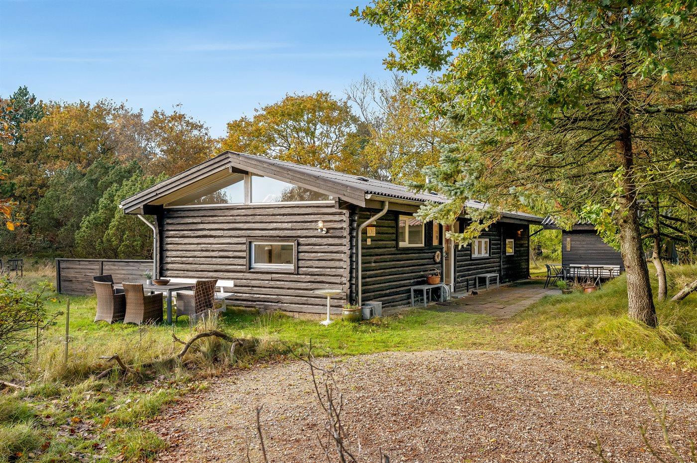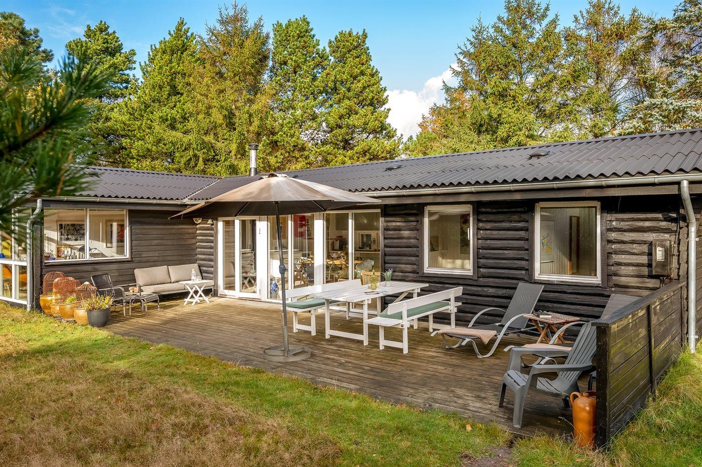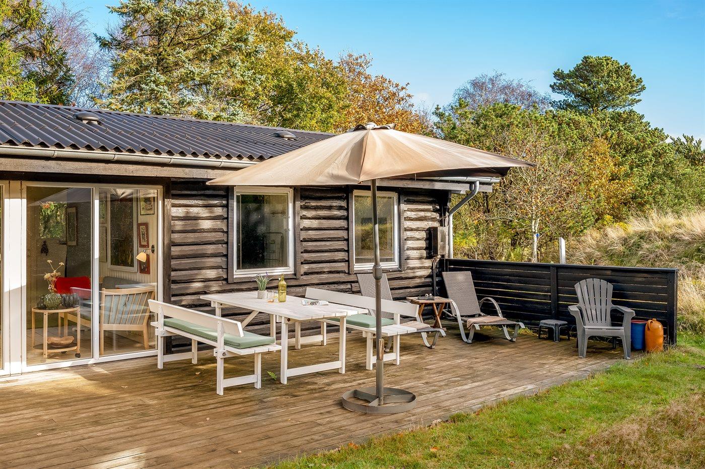 Hyggeligt og rummeligt bjælkehus nær Torp Plantage på Fanø med stor terrasse og internetadgang.
