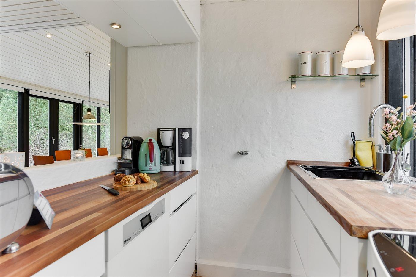 Køkkenet er udstyret med 1 køleskab. Der er 4 keramiske kogeplader, varmluftovn, mikrobølgeovn samt opvaskemaskine.