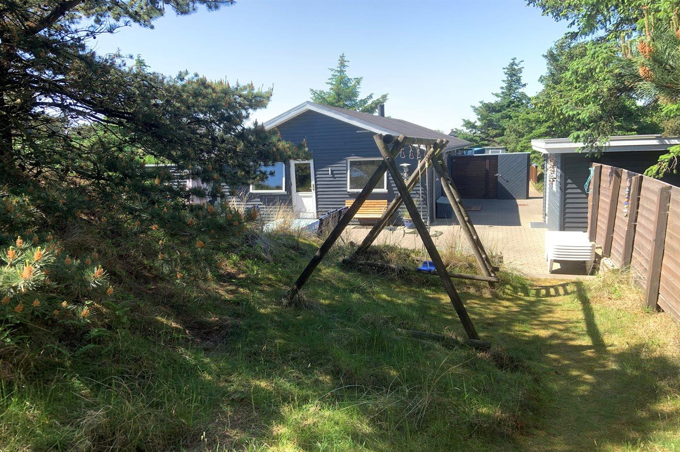 Ferieboligen er beliggende på en 2400 m² stor naturgrund. Der er 500 m til havet. Nærmeste forretning er beliggende i en afstand af 950 m. Til ferieboligen hører 124 m² terrasseareal. Desuden er der 19 m² overdækket terrasse. Gynge. Sandkasse. Udendørs bruser. Der er installeret stik til opladning af elbil. Type 2 stik. Med 11 kW ladeeffekt. Parkering ved ferieboligen.