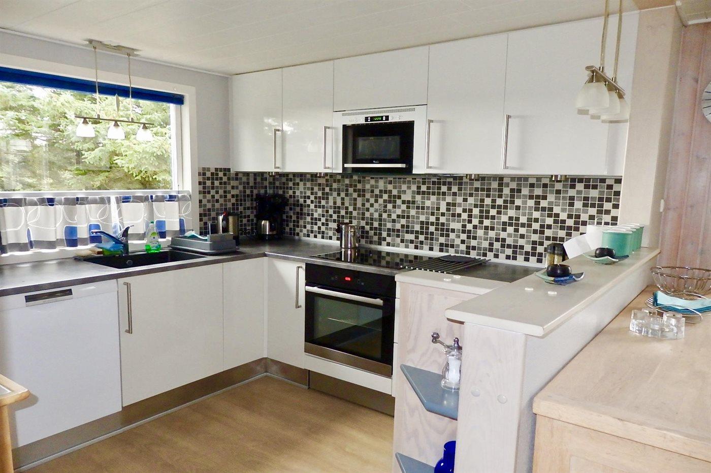 Køkkenet er udstyret med 1 køleskab. Der er 4 keramiske kogeplader, varmluftovn, mikrobølgeovn samt opvaskemaskine.